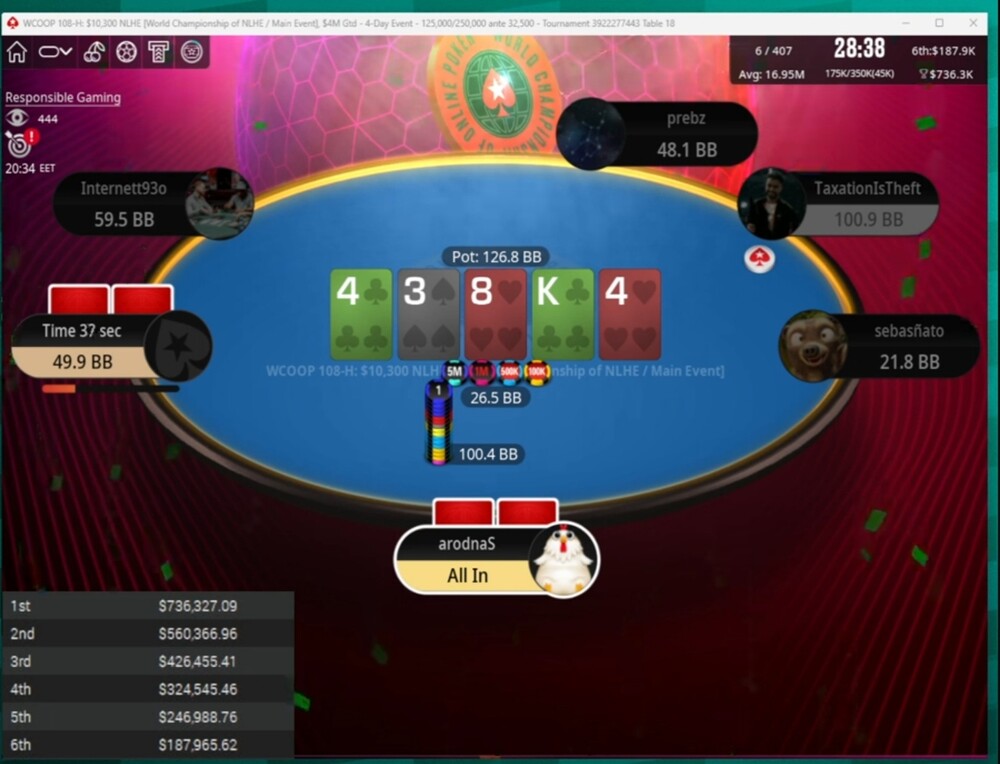 Просто овербет пуш два банки (з урахуванням ефективного стеку) в обличчя!👊🫨 Ось так. Уявіть себе на місці ILS)) ІСМ тиск, фіналку життя можливо і така роздача... Я б тут закопав усе нижче за тріпс з високим кікером)) ЕР дуже довго думав, спалив увесь таймбанк і коли вже залишалося 10 секунд таки натиснув кол з АК!