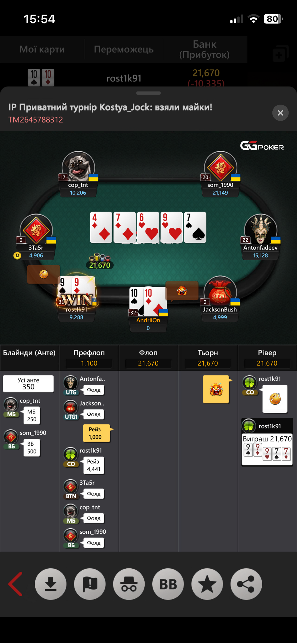 Я теж ))🤝 ... Флеш не доїхав, трохи втратив) ...потім ще пару роздач в мінус пішов ...) Ну заключну префлоп оллин я KQ ,опп кол 88 і йому сет доїхав )