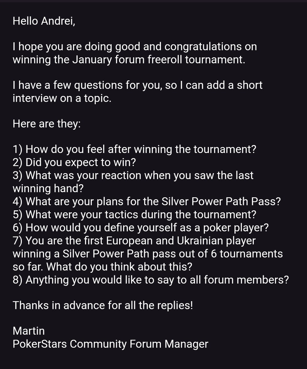 Я сподіваюся, що у вас все добре, і вітаю з перемогою у січневому турнірі з фріролів форуму.