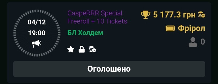 Назва - CaspeRRR Special Freeroll + 10 Tickets.