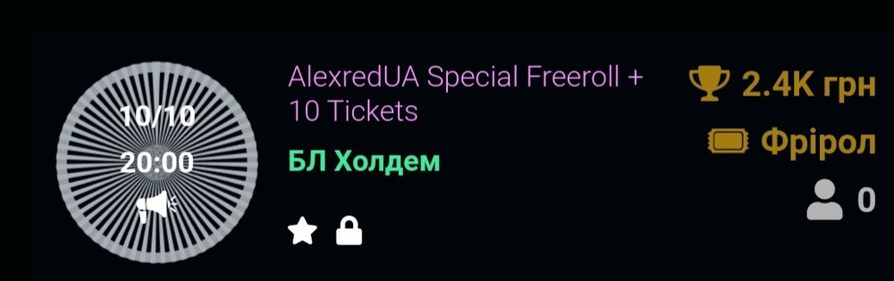AlexredUA Special Freeroll + 10 Tickets. Старт - о 20:00. Пізня реєстрація - 30 хв. Бай-ін - 0*, ребай - 100*