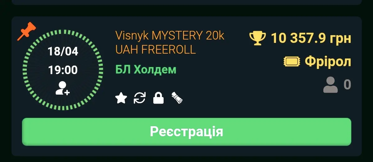 ₴10,000 – призовий фонд самого турніру. Ще ₴10,000 – це додаткові призи для топ-20 гравців. 🎁 Призи для ТОП-20 гравців: 1 місце — квиток номіналом ₴2,800 у |MBS| MYSTERY MAIN #9 2–5 місця — квиток у |MBS| Mini Mystery Bounty 6–10 місця — фрибет на спорт ₴250 11–15 місця — покерний релоад-бонус ₴1,000 16–20 місця — спорт-бонус ₴500