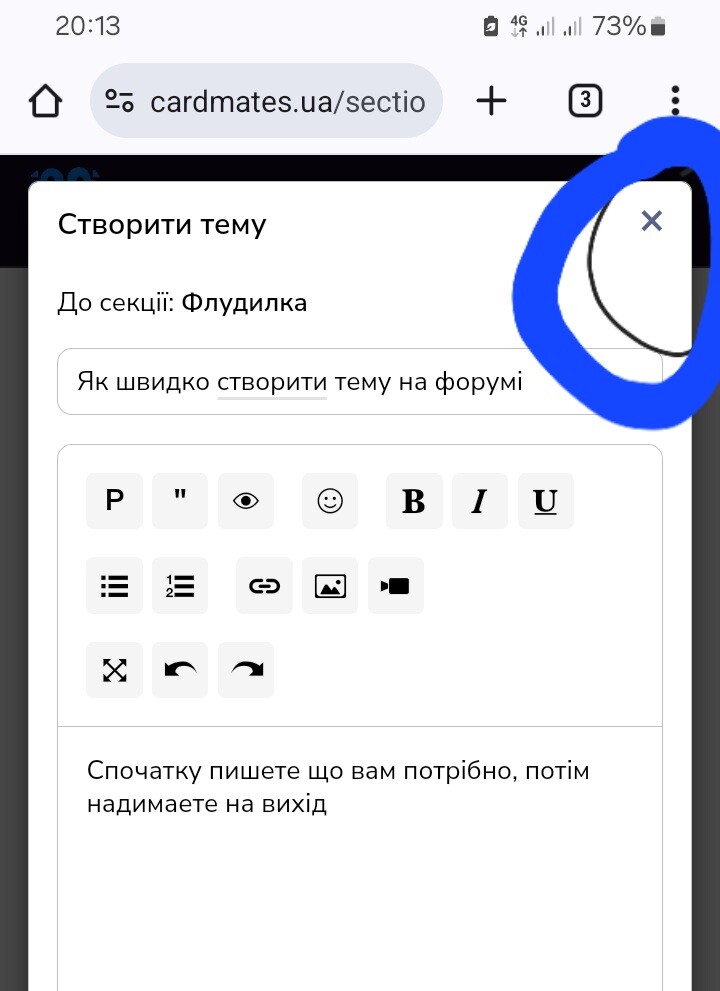 Якщо хочеш щось написати на форумі, то іноді після додавання картинок зникає кніпка додати тему,а я описав спосіб що зробити щоб вона з,явилась знову,без мороки)
