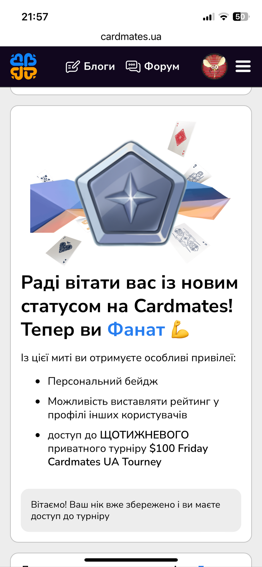 Тільки хоп і тепер я в групі над якими всі хіхікають 😁 ФАНАТ ! Відчуваю, що це буде не надовго, адже цілі такої не ставив а просто спілкувався з приємними людьми))) і якщо я так на легкому отримав цей значок то і наступний прийде так само не напряжно і швидко)) і я впевнений легендарний Містер Кек вже поглядує в мою сторону і переглядає повчальні відоси як трибетити незрозумілого опонента 🤣🤣🤣 всім удачі за столами!!!