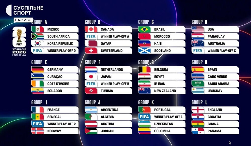Стали відомі всі групи чемпіонату світу-2026, який пройде з 11 червня до 19 липня. Формат розширений: до плейоф виходять топ-2 з кожної групи, а також вісім найкращих третіх місць.