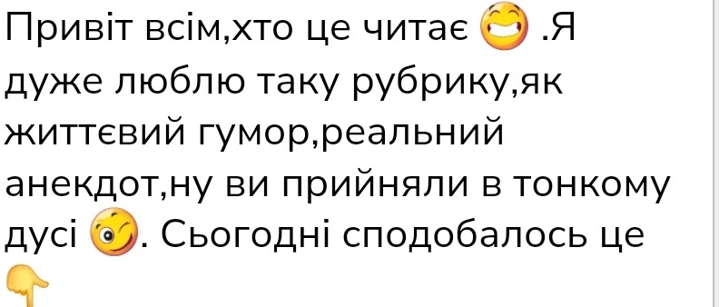 Привіт всім,хто це читає .Я дуже люблю таку рубрику,як життєвий гумор,реальний анекдот,ну ви прийняли в тонкому дусі . Сьогодні сподобалось це 👇