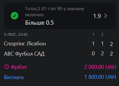 Коли отримав фрібет, то поліз в live і там надибав матч Спортінга проти АФС (це команда, яка йде на останньому місці в чемпіонаті Португалії). На той момент рахунок був 2:1 на користь Спортінга і йшла 76-та хвилина матчу. Отож, я вирішив поставити на те, що буде забито гол з 81-ї по 90-ту хвилини матчу, бо вважав, що Спортінг має дотискати аутсайдера наприкінці матчу, але... Все пішло трохи не за планом, бо забили дуже пізно (аж на 90+2) і зовсім не ті від кого я цей гол очікував😉