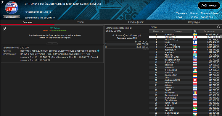На Старзах в рамках серії EPT Online 2020 завершилась Головна Подія, яка обійшлоася гравцям в 5 200$ c гарантованими призовими в 5 000 000$. За допомогою 1 304-х входів гарантію вдалося перебити аж на 1 520 000$ і загальні призові склали 6 520 000$.