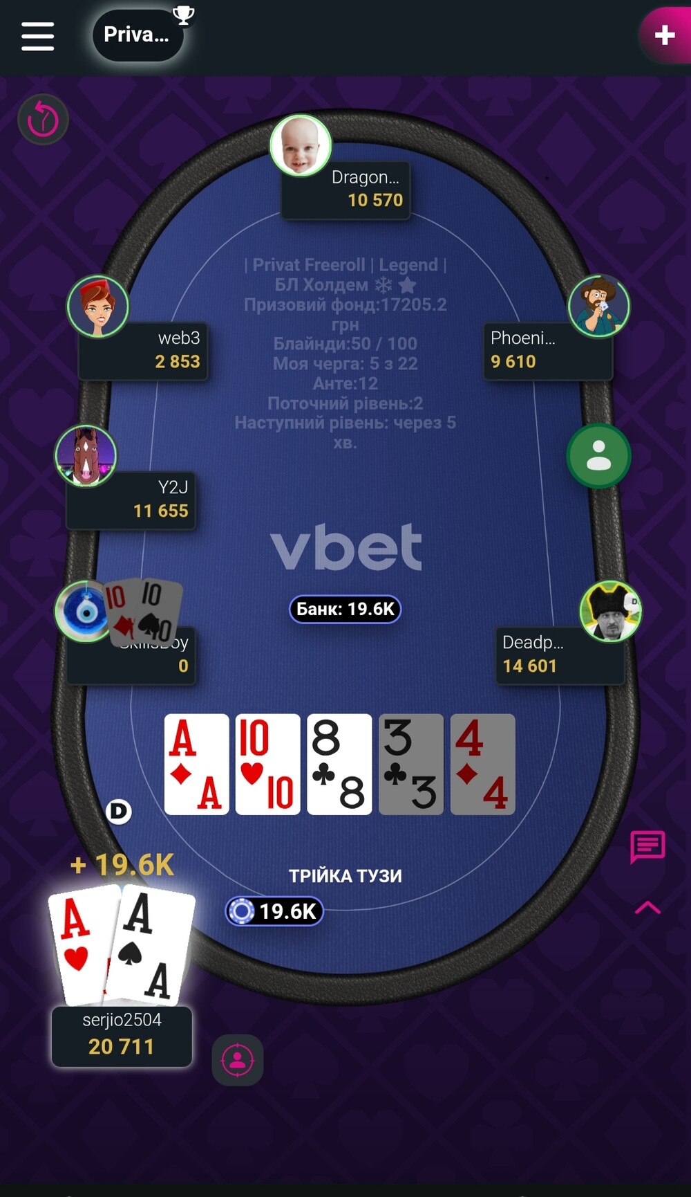 І тут сталося, щось дивне. ГВЧ зламався, чи то пан Веб3 знайшов горщик із удачею, але йому поперла карта, як із рогу достатку. Хлопці не дадуть збрехати, та і він я думаю поділиться цим у своєму дописі. Отже він почав вибивати опонентів один за одним. І так я потрапив у призи. І залишилося нас четверо. Три Легенди і із фішками, як кіт наплакав і чіпак Веб3. Переможець уже, майже, був відомий. Але ми билися, як леви, до самого кінця. Залишилося нам трьом розподілити місця. І так виявилося що мені дісталося найвище місце серед Легенд.
