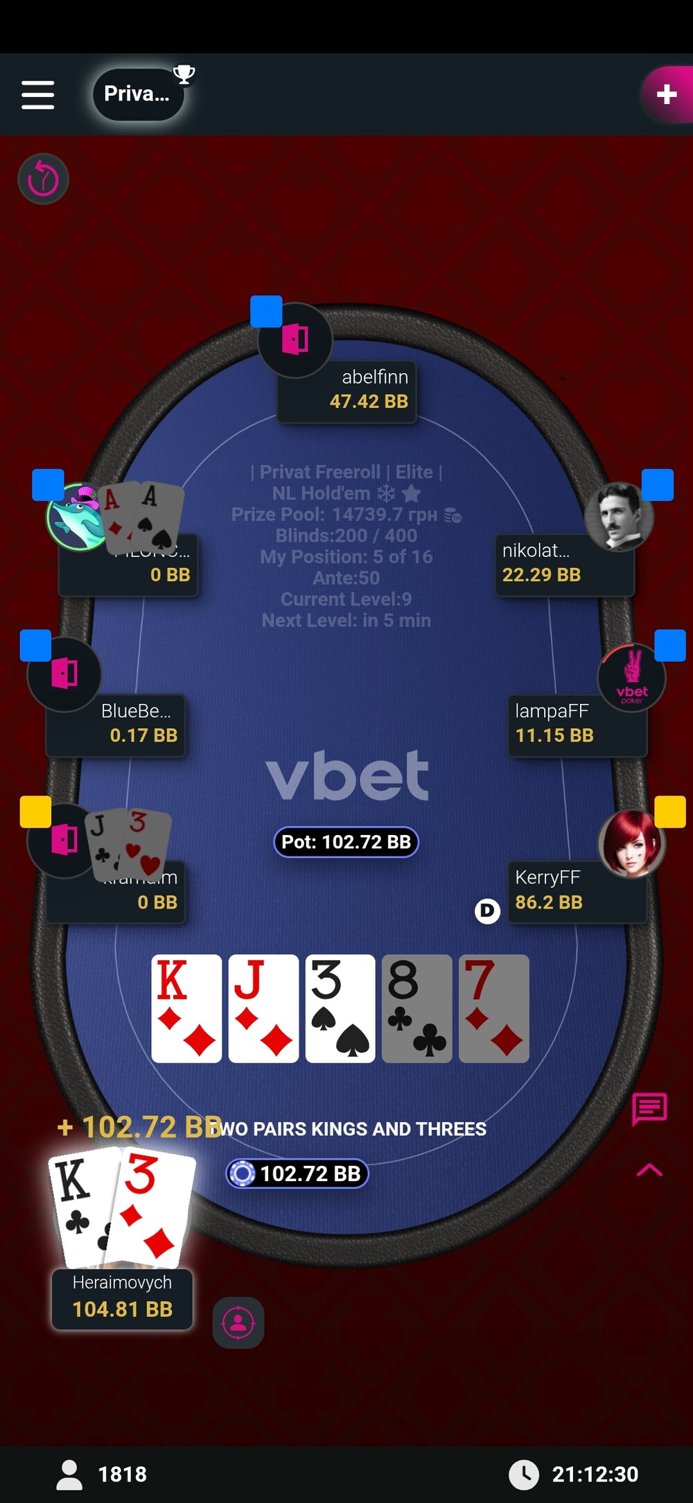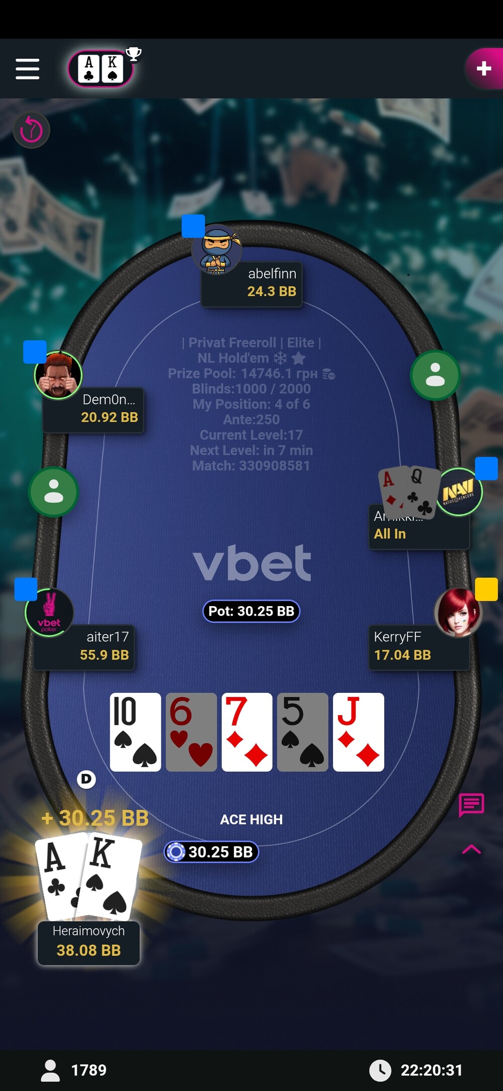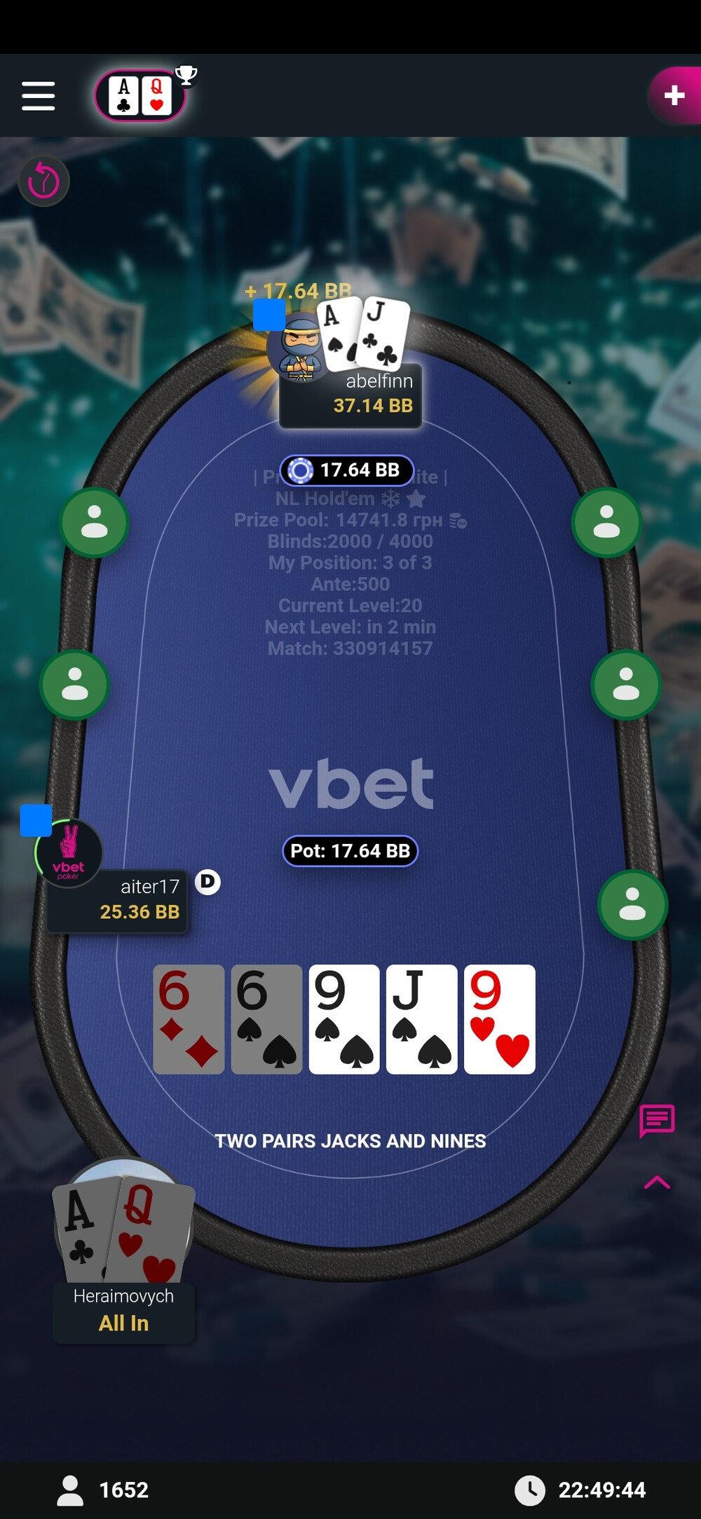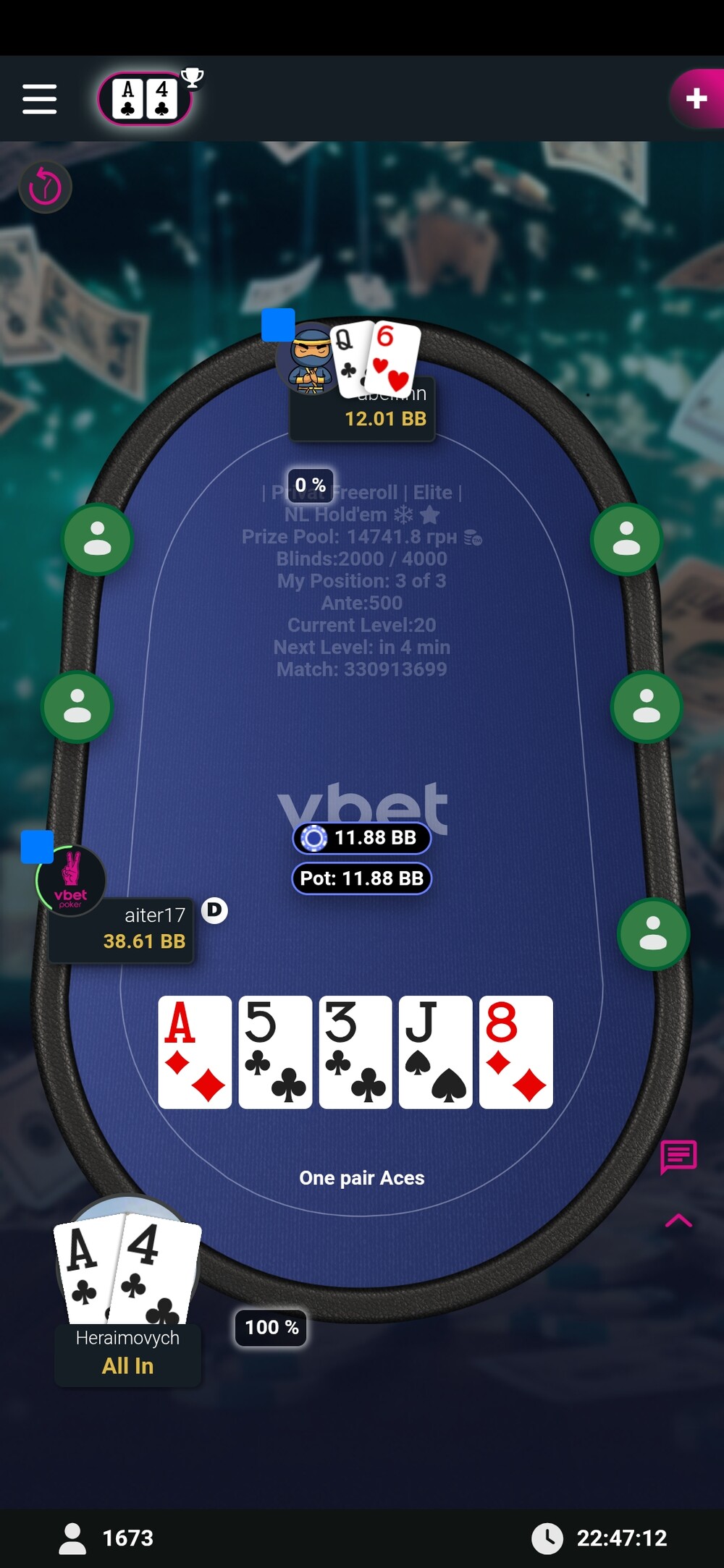 Вже на фінальному столі вибиваю суперника і оформлюю стадію бабла. Префлоп виставлення.
