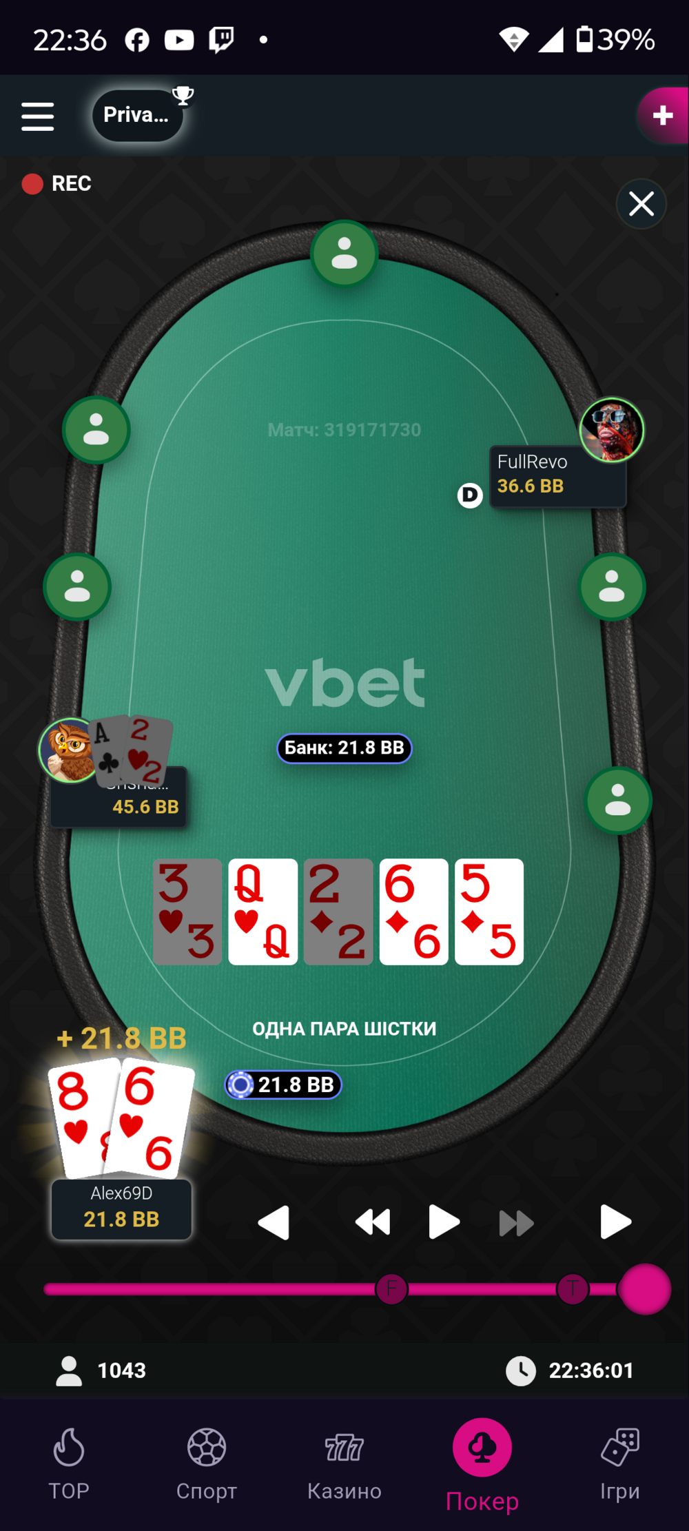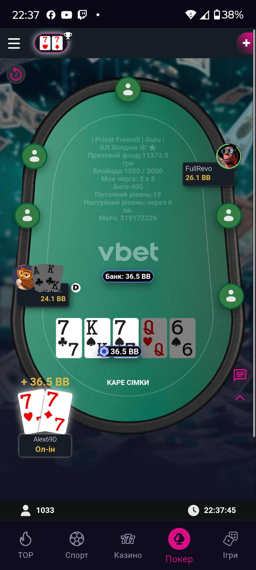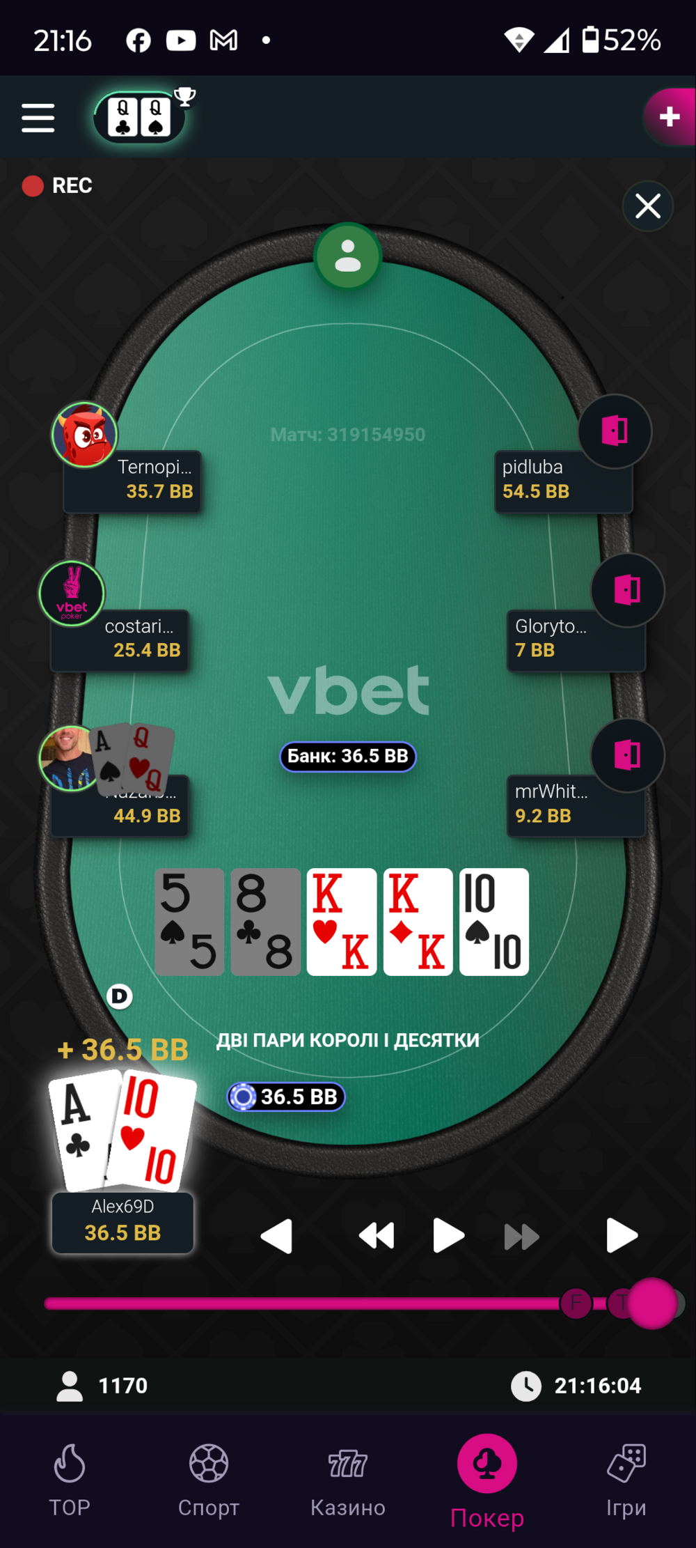 Визнаю переоцінив свої можливості і не до оцінив суперників.Особливо це було помітно в грі з Тобою при тому декілька разів.Початком кінця виявилась роздача проти каре 7777.
