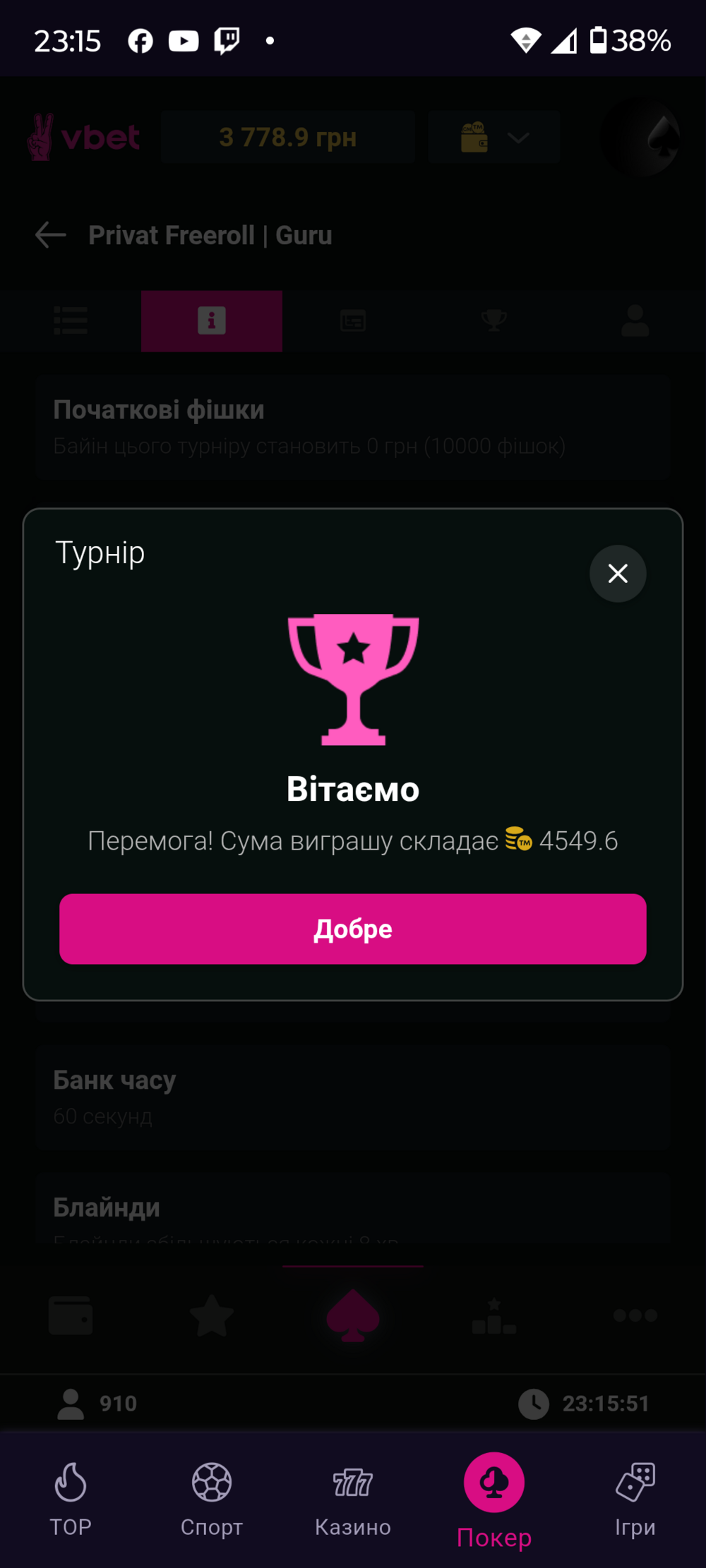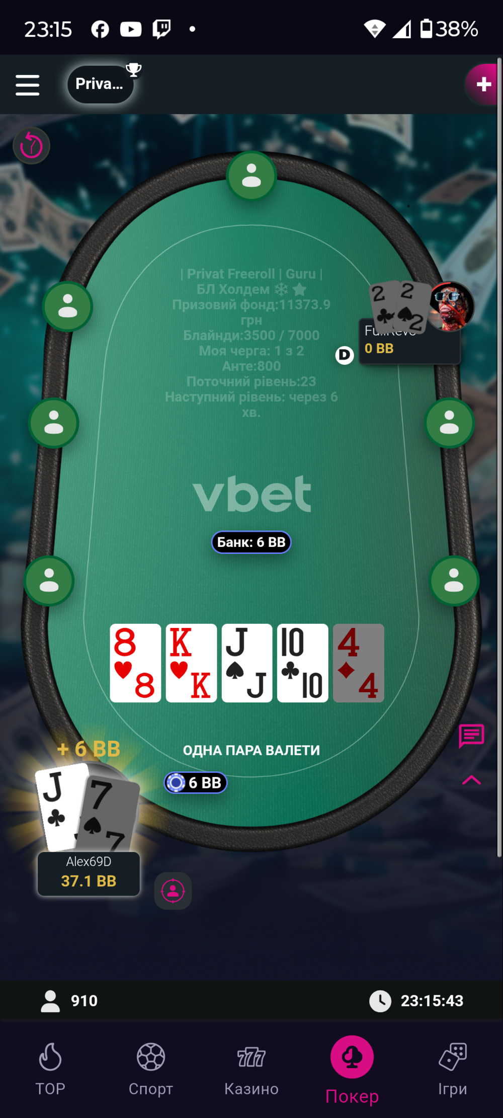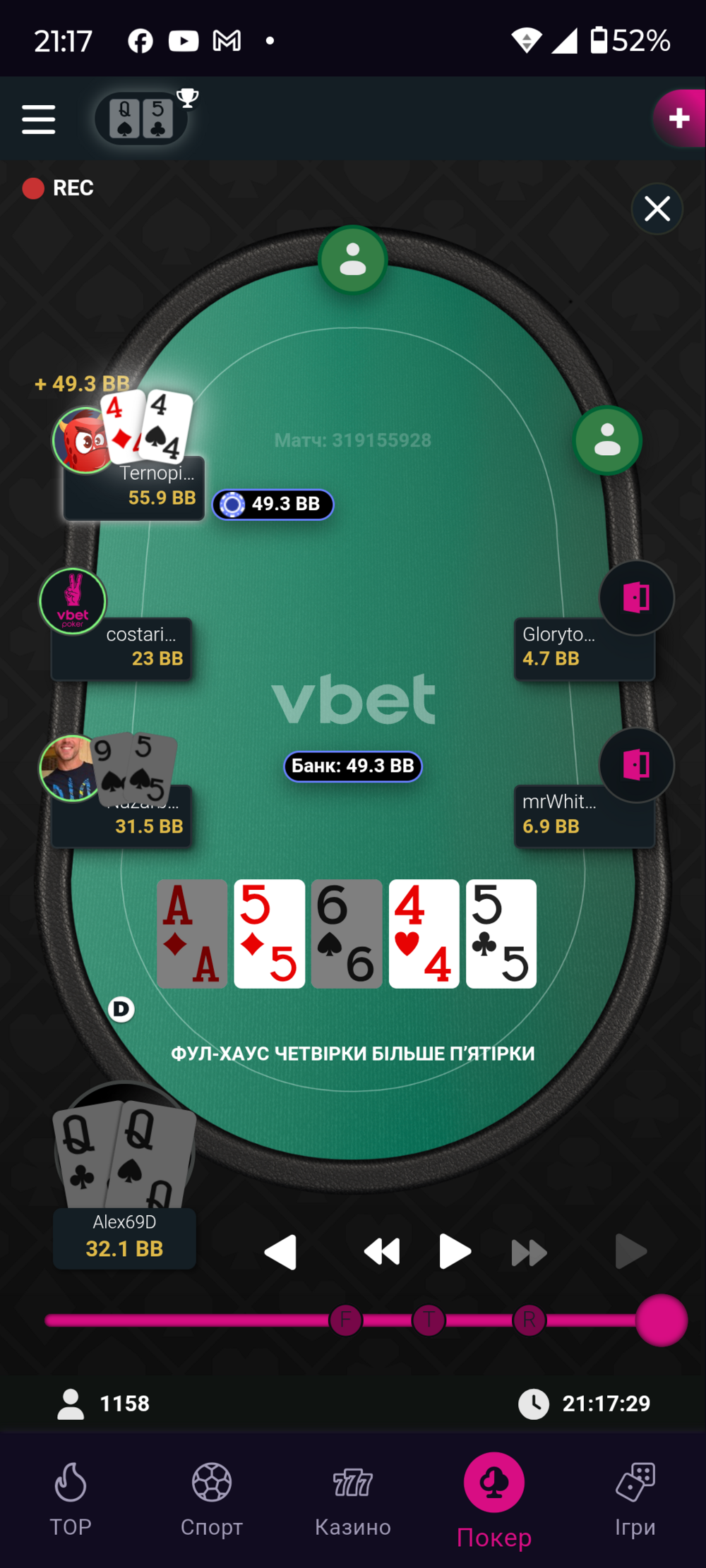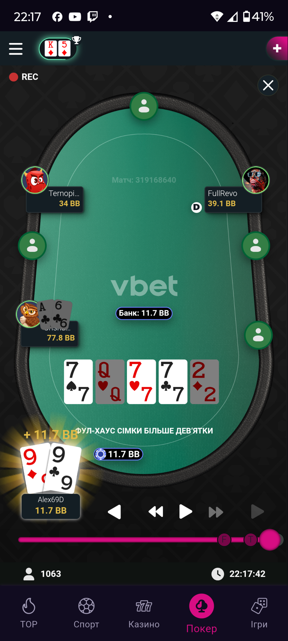 Визнаю переоцінив свої можливості і не до оцінив суперників.Особливо це було помітно в грі з Тобою при тому декілька разів.Початком кінця виявилась роздача проти каре 7777.