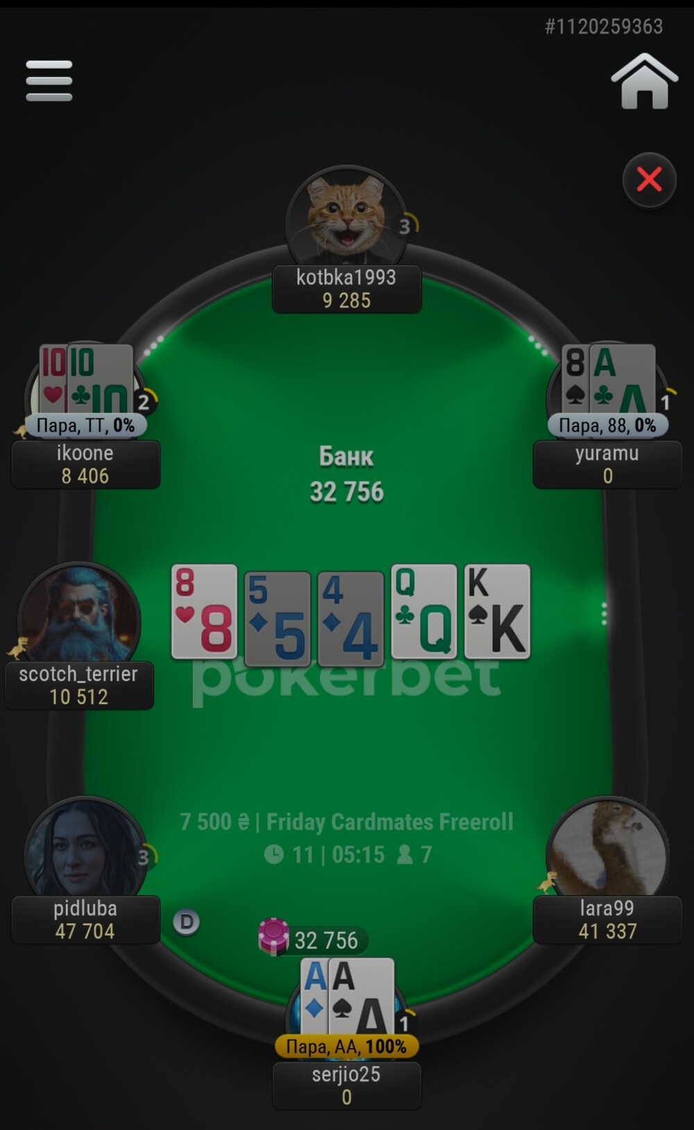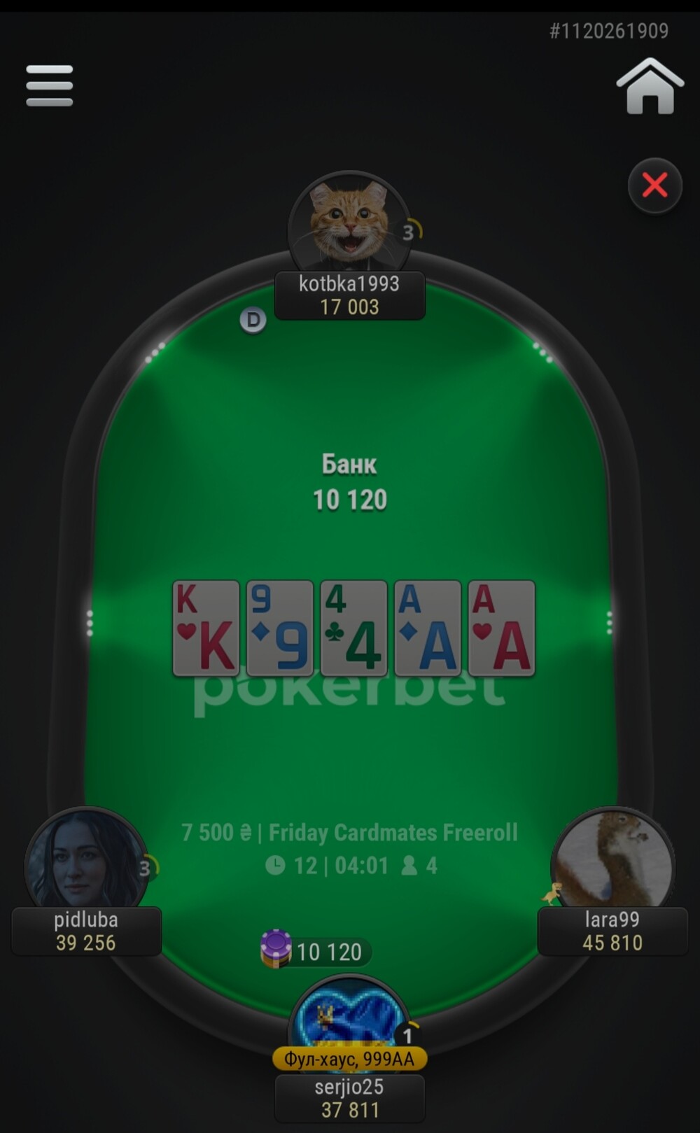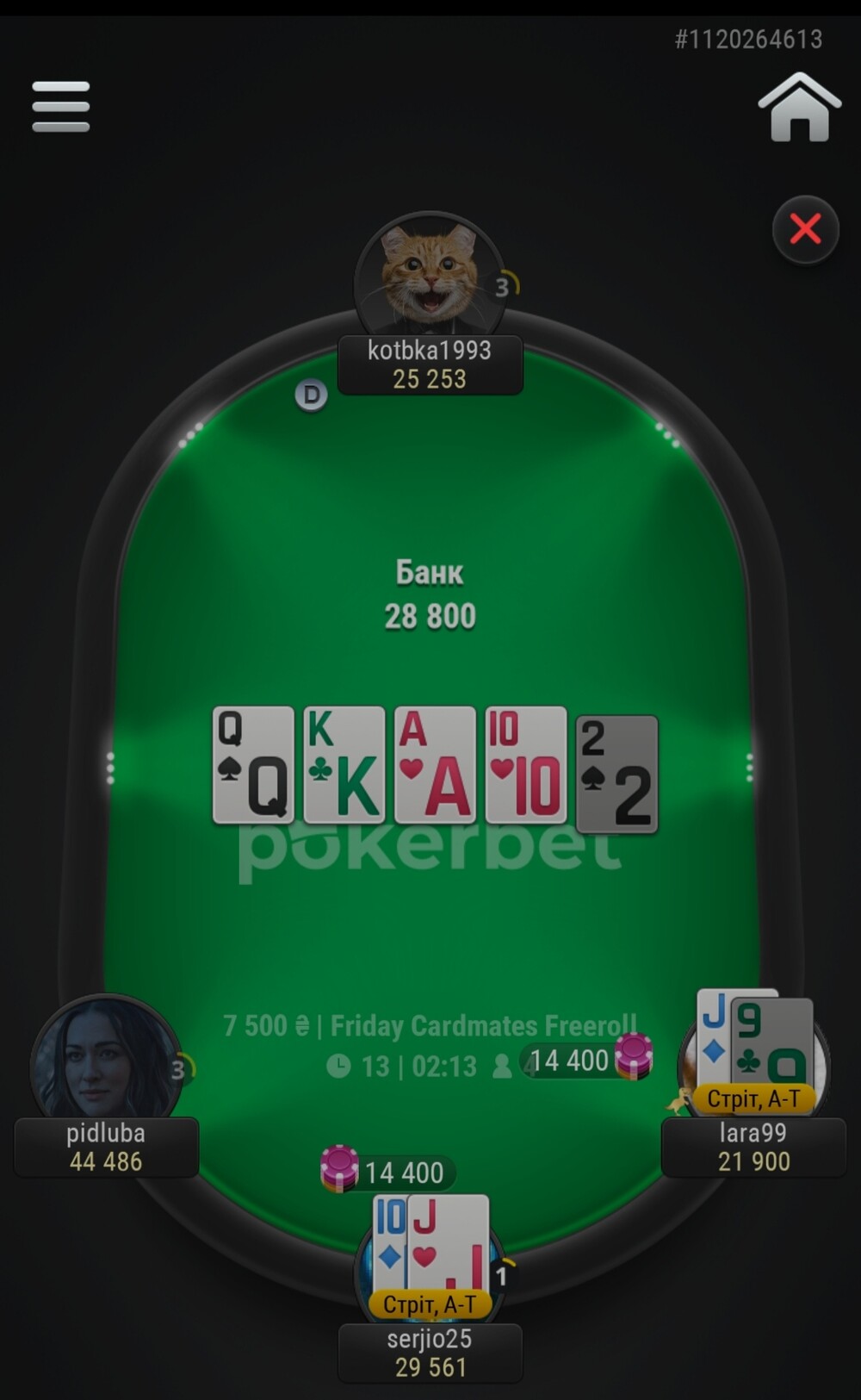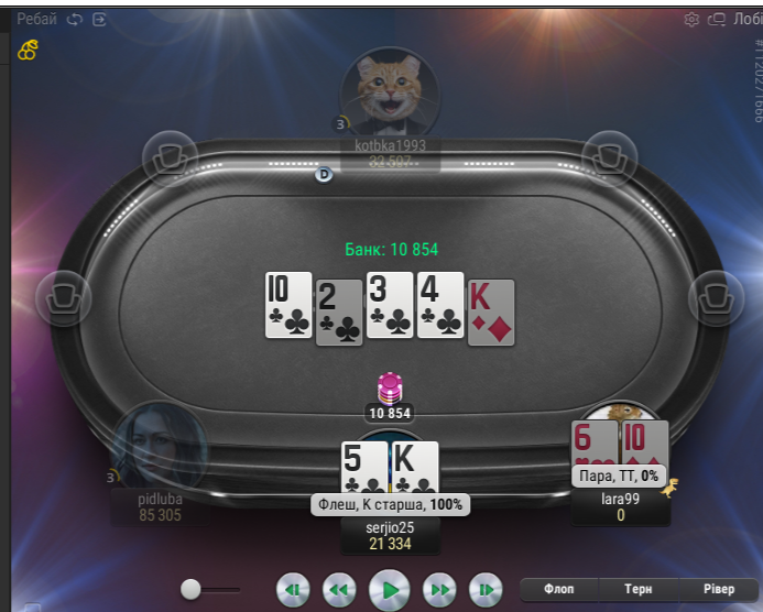 І тут щось сталося. У Підлуби проти мене стало все закриватися і Котька не пас задніх. Я потроху почав прямувати до бабл боя. Мені цього дуже не хотілося. Як я писав у грі, я здалеку нагадував Сімбу. І в цій роздачі Сімба виріс у справжнього лева😁.. Після флопа Lara99 ол-інн я кол.