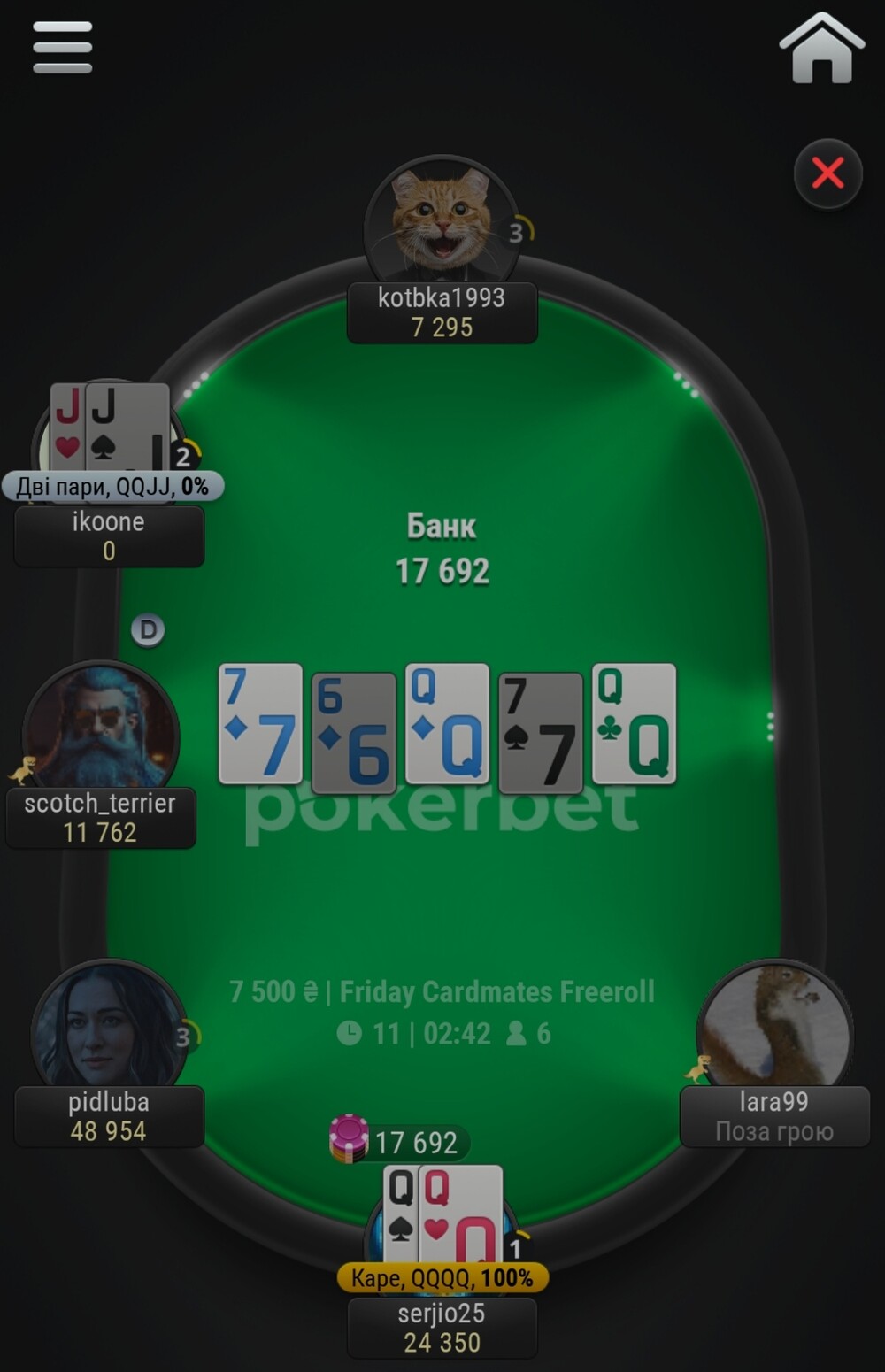 Ось іще одна роздача. Lara99 билася як левиця👍. Та і я з далеку нагадував Сімбу😁.