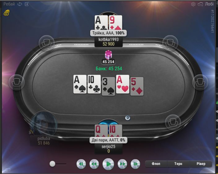 Потім знову карта без попередження зникла. І я просто сидів і дивився як люди грають. Час від часу вставляв свої п'ять копійок. Так ми догралися до бабла. Бабл був ну дуже довгий. Фішки кочували від одного до іншого. Ось одна із роздач, яка принесла мені трішки фішок.
