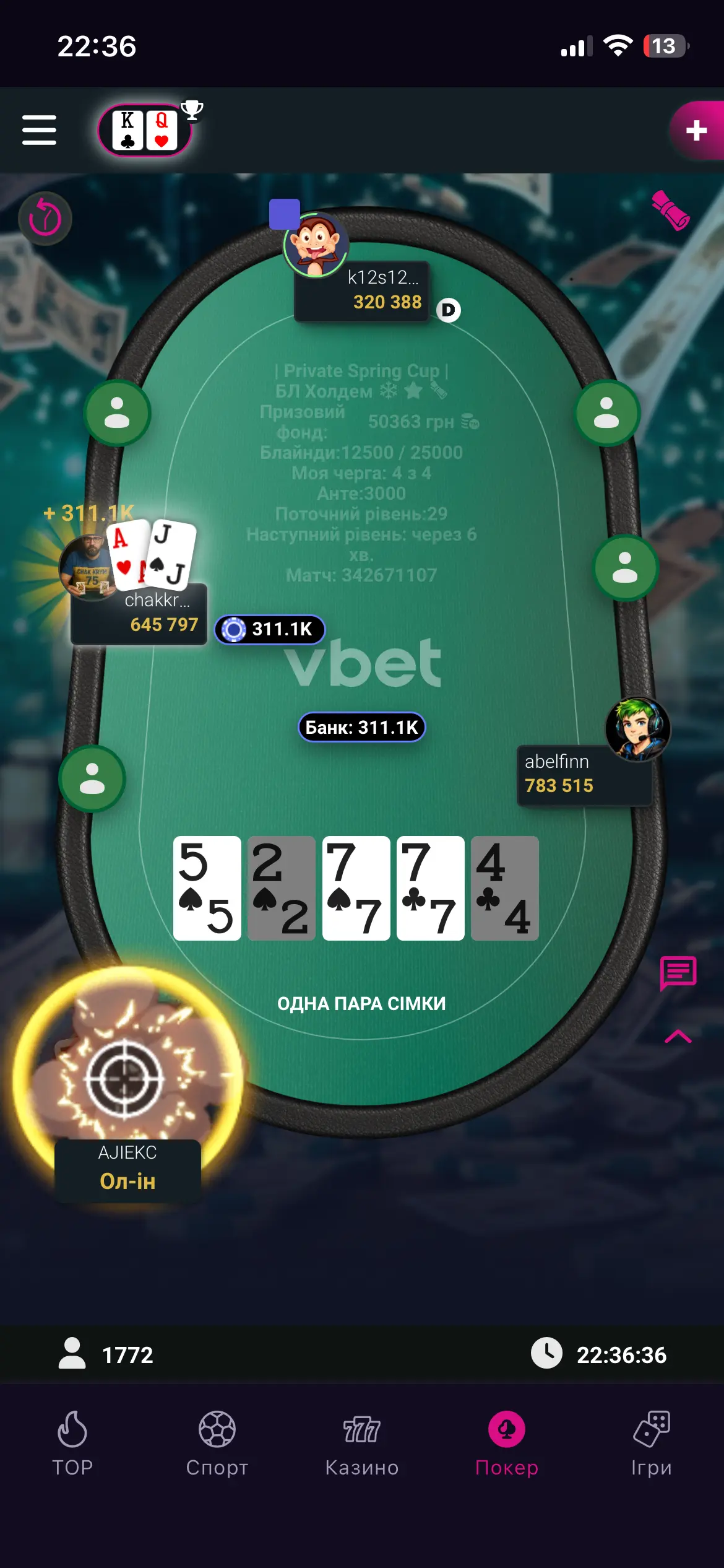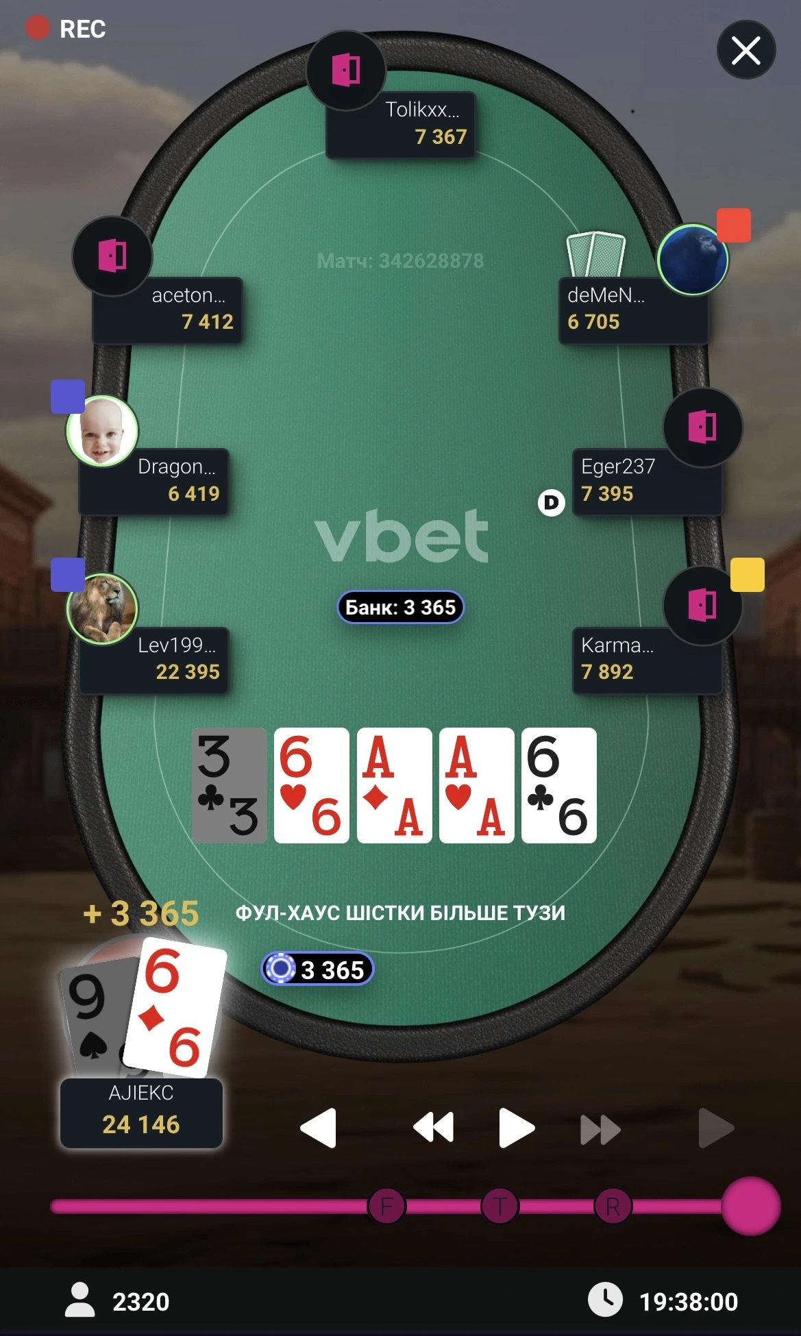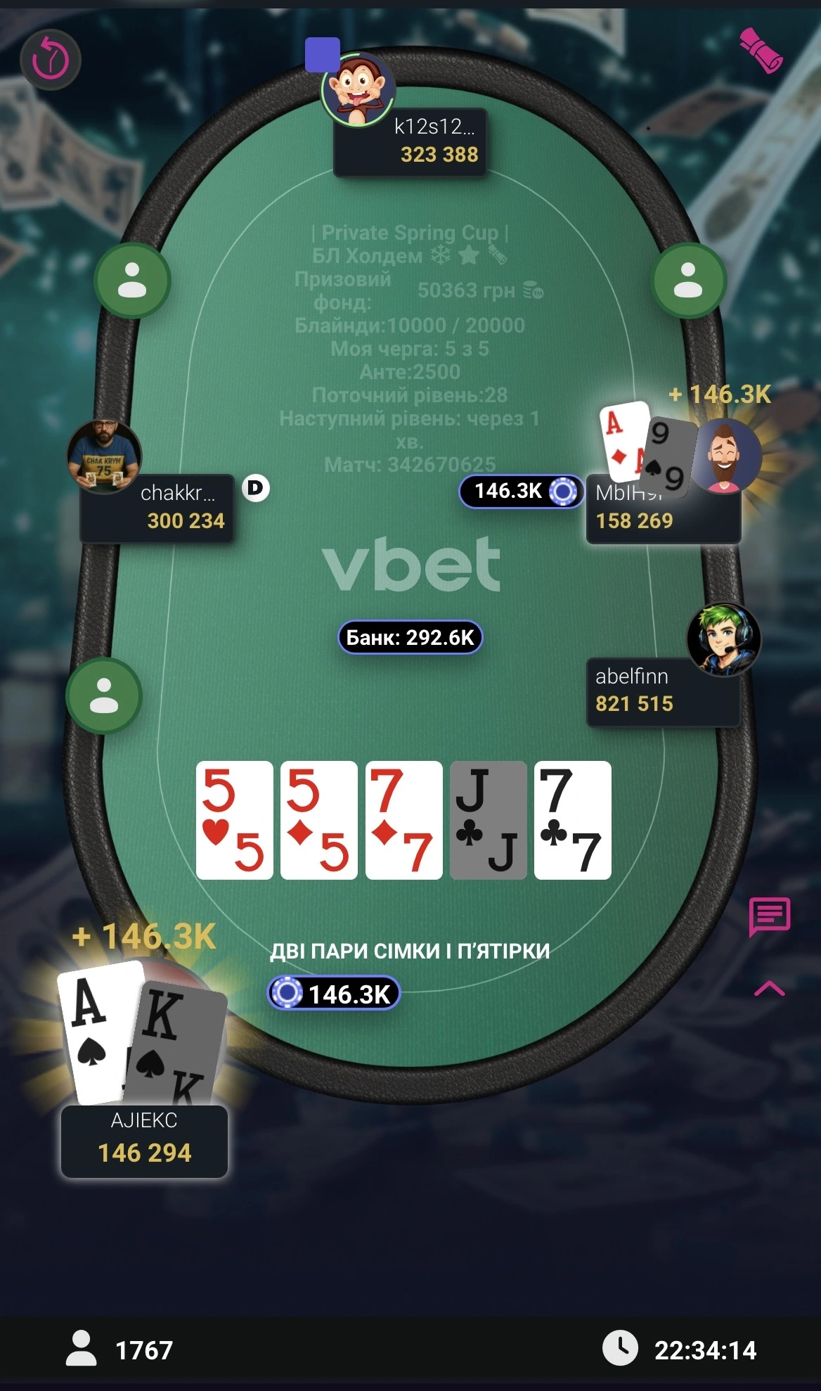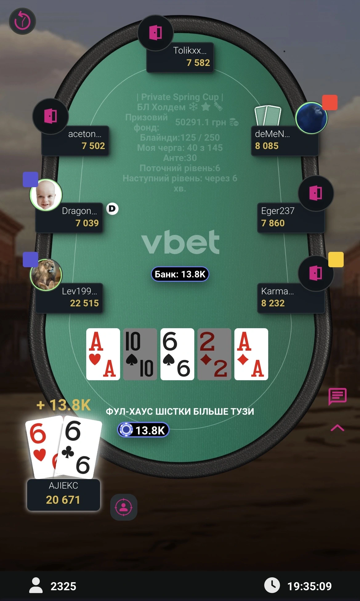 Фіналочку грав спокійно, вижидаючи гарну руку. Зайшло АК, але і те А9 не перебило