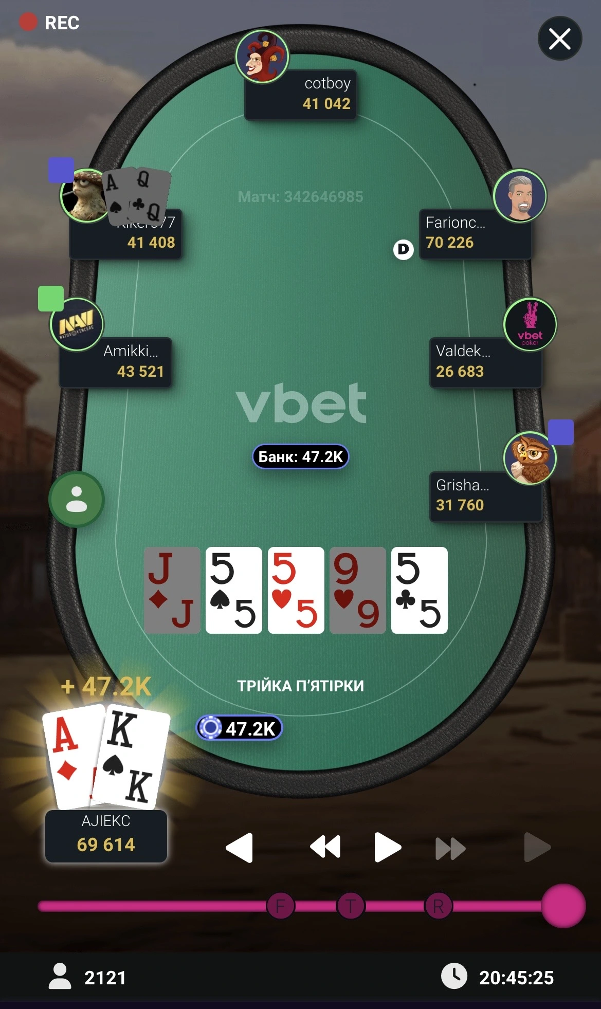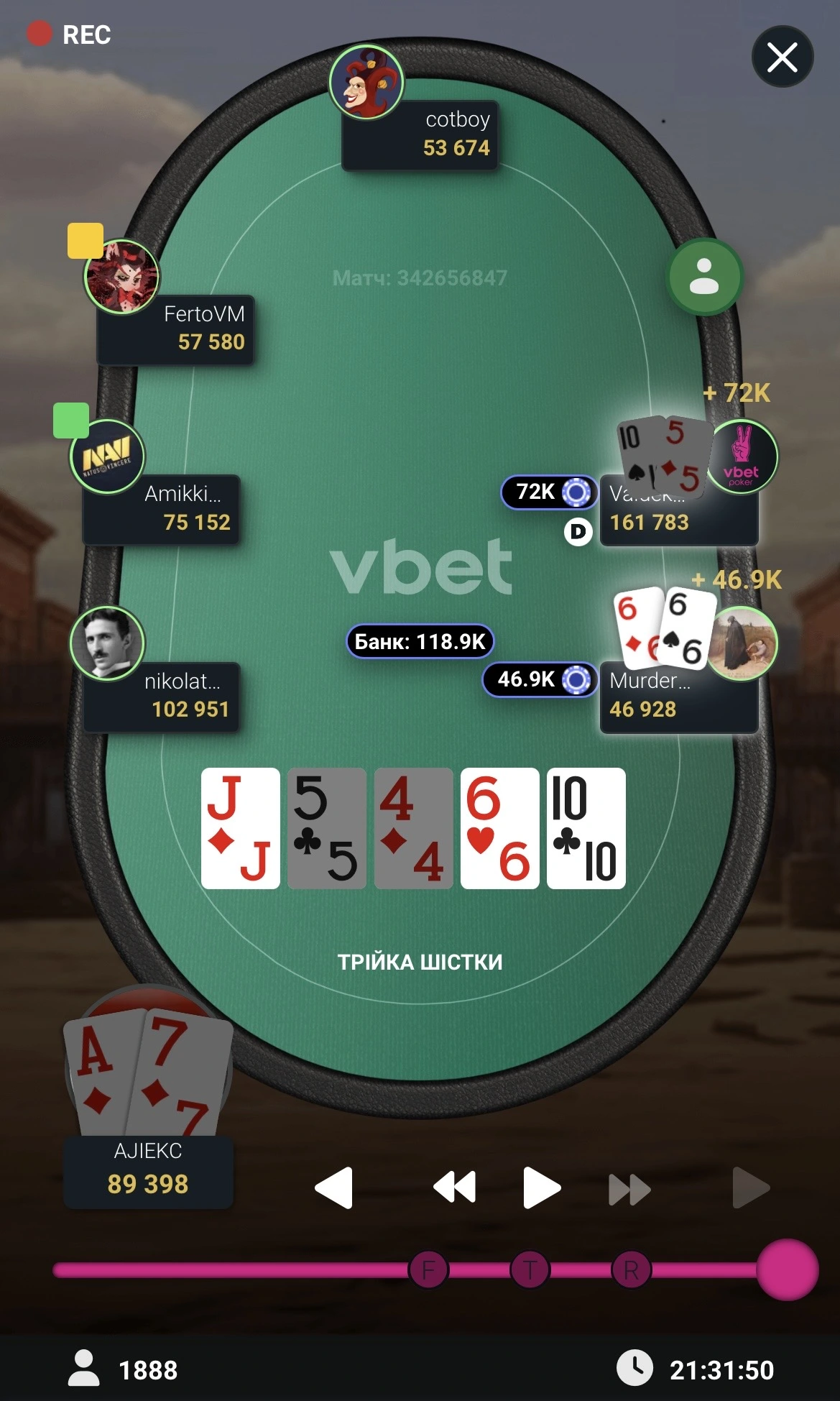 Найбільше запамʼяталась роздача в якій мені не закрився ані флеш, ані стріт. Трішки програв, але якби закрилось хоч щось то виграв би набагато більше, так як в суперників були непогані комбінації..