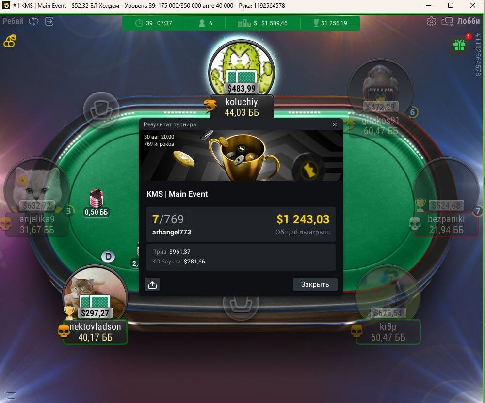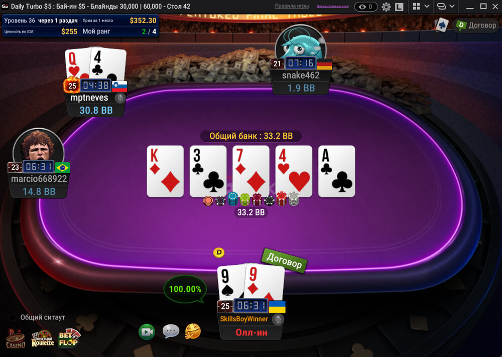 ↪Тож вхід у мене був лише один. Скринів я нажаль не робив, бо не збирався робити пост. Весь турнір я йшов гарно, завжди з середнім стеком, через 3 години я вже відбив вхід та навіть плюсанув на цукерки. (75$). До предфінального столу я дійшов с коротким стеком, та баунті +200$.