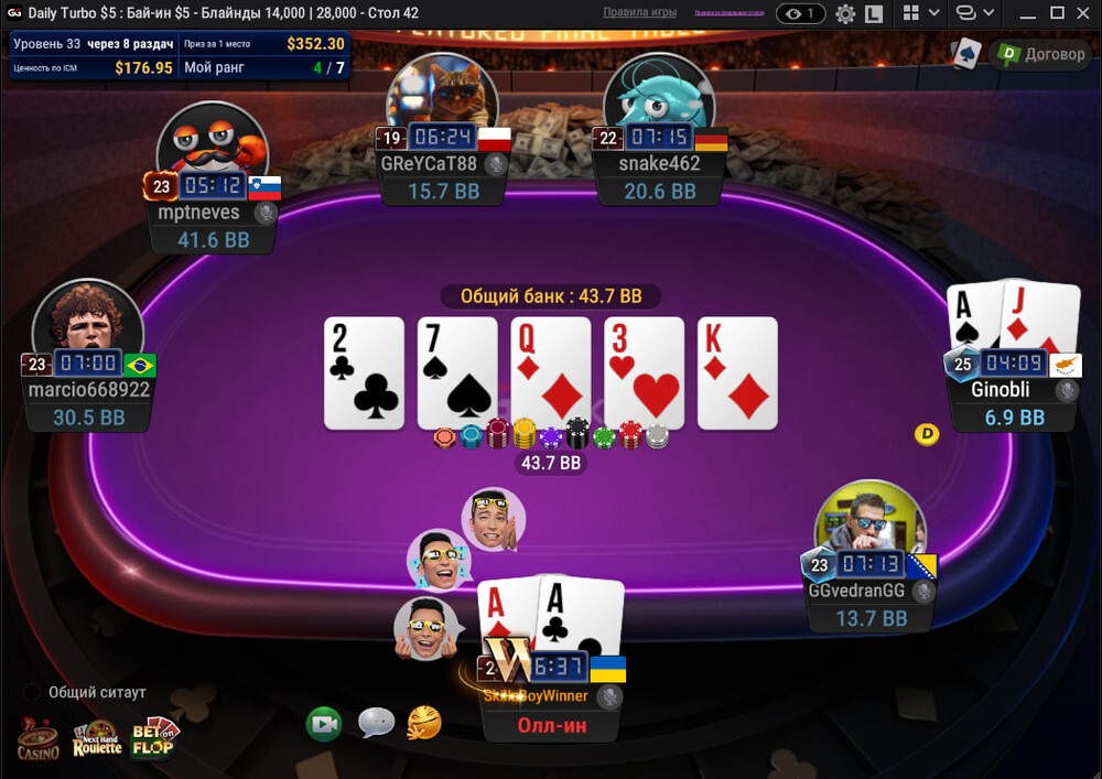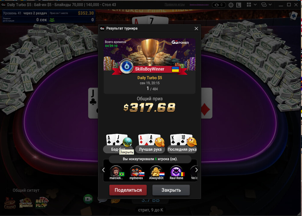 ⭐Ну а вчора вирішив зіграти на GG декілька турнірів: 8.8$(Турбо), 2$ (Г.турбо), 5$ (Г.турбо) та за 5$ (турбо).