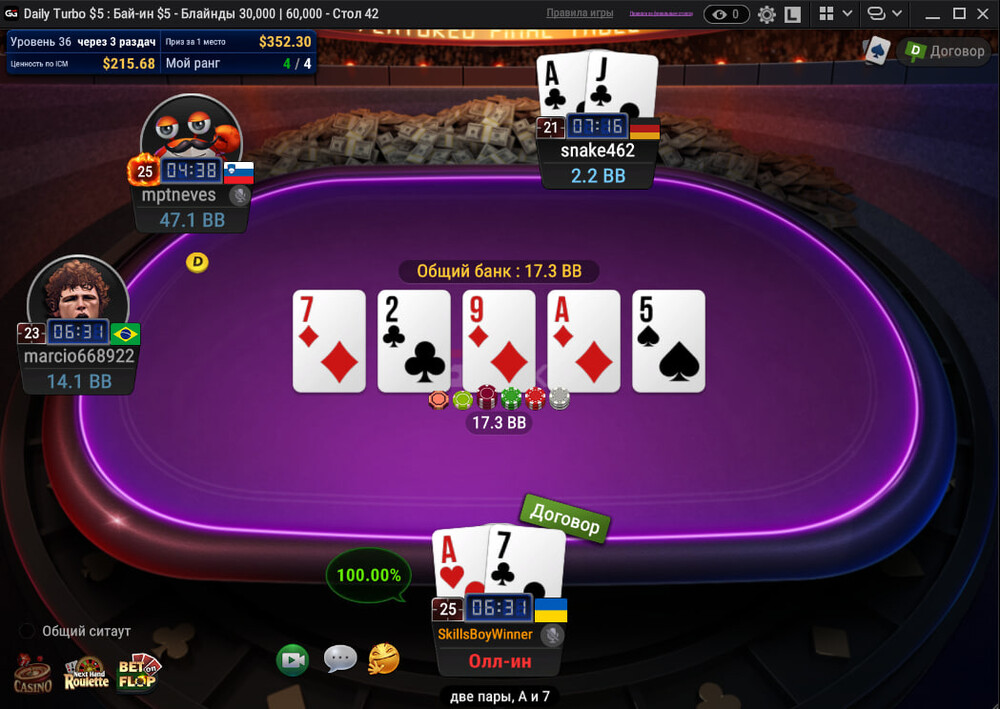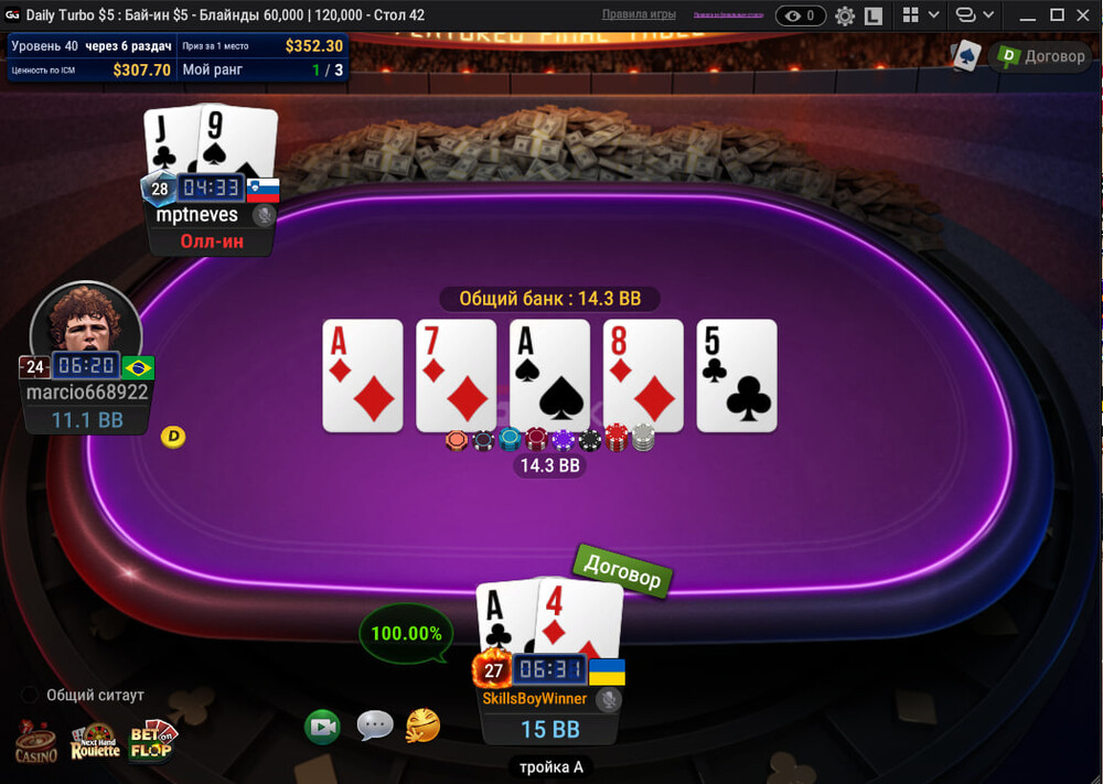 На предфінальному було не легко, трохи пощастило в монетці з Ах, забирав всі свої ББ та МБ рестілами та вдалося вийти на фінальний стіл з коротким стеком.