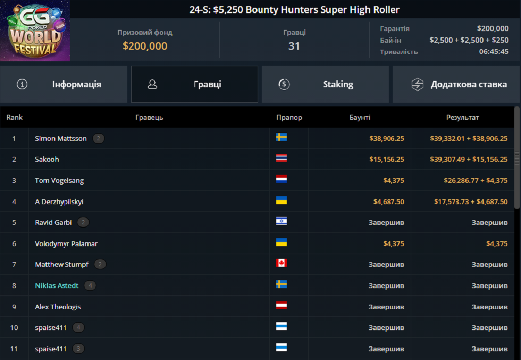 Серед найкращих покеристів в онлайні дуже багато є покеристів зі Швеції. Чого вартий справжній GTO-калькулятор Ніклас Астедт, який нещодавно став третім у вищезгаданому Super Million$ та заробив 202 430$. Його співвітчизник Саймон Меттсон в свій час був найбільш успішним онлайн-покеристом (у 2016-му році) і з того часу постійно перебував на топових позиціях. Декілька днів тому він став чемпіоном обговорюваного турніру 24-S: 5 250$ Bounty Hunters Super High Roller та заробив 39 330$ і ще 38 900$ за вибивання своїх суперників.