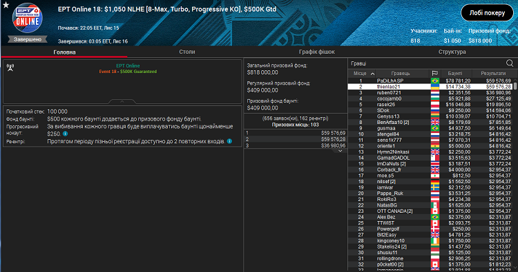 Минулої ночі він став ранер-апом нокаут-турніру EPT Online 18 на PokerStars вартістю 1 050$ з гарантією 500 000$ і заробив 59 570$ + баунті 14 730$. Ці призові поки що є найбільшими в кар'єрі новоспеченого покериста.