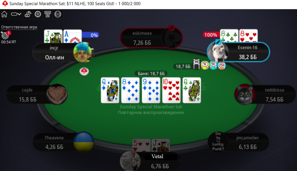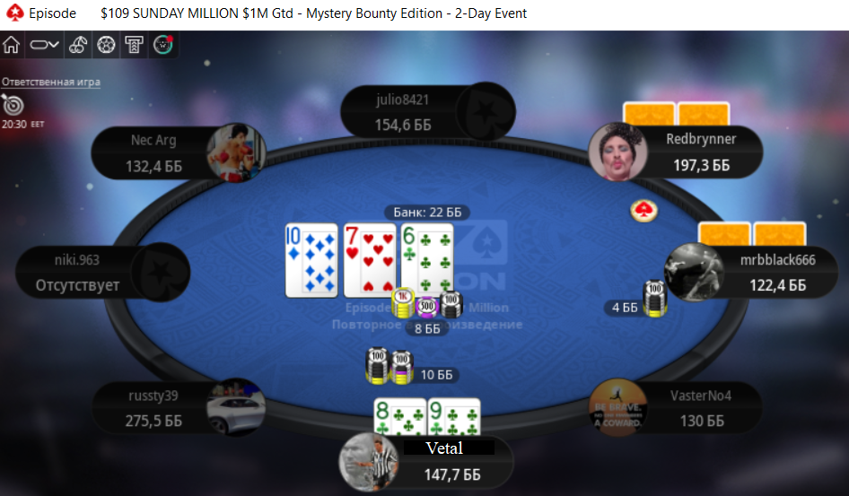 Сателіт за $11, відбір на мій улюблений Sunday Million. Йде бабл, я слідкував за кожним другим столом (більше не вміщалось на екрані) та за кожним столом був чипак котрий кожну руку пушив або відкривався 2-3вб та готовий закрити олін, тим самим робивши тиск на коротунів. В мене за столом теж був такий спортсмен (Esenin-16). За кожним столом був коротун 2-4вб, тож треба було просто пересидіти й не замазуватись.