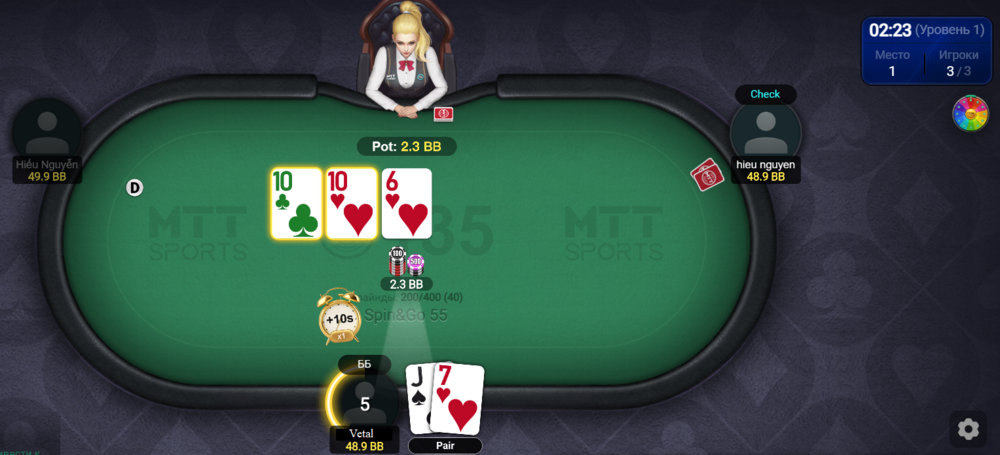 На МТТ спортс є турніри Spin&Go, найдорожчий за 55 монет, це приблизно 2-2.5 бакси. Їх так мало грає гравців що інколи доводиться чекати й пів години. Ту не має джек потів, а найбільший приз може бути 500 монет, в мене був один раз приз 300 (не нагадуйте про тракториста) та 250 монет. Частіше всього приз випадає 135-180 монет.