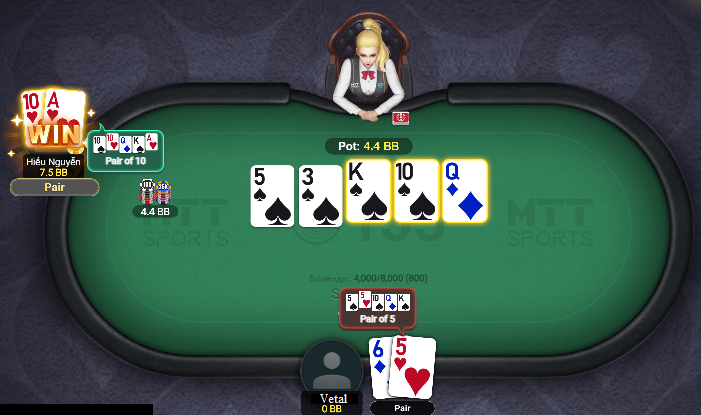 П'ятірка, просто найкраща карта яка могла бути, жодних вагань щодо прийняття рішення та як грати. Пот вже сформований так аби поїхати на всі.