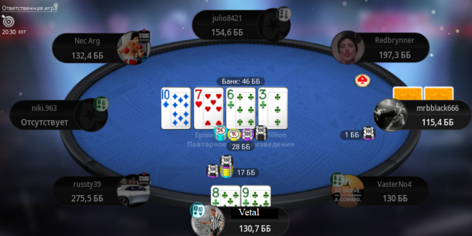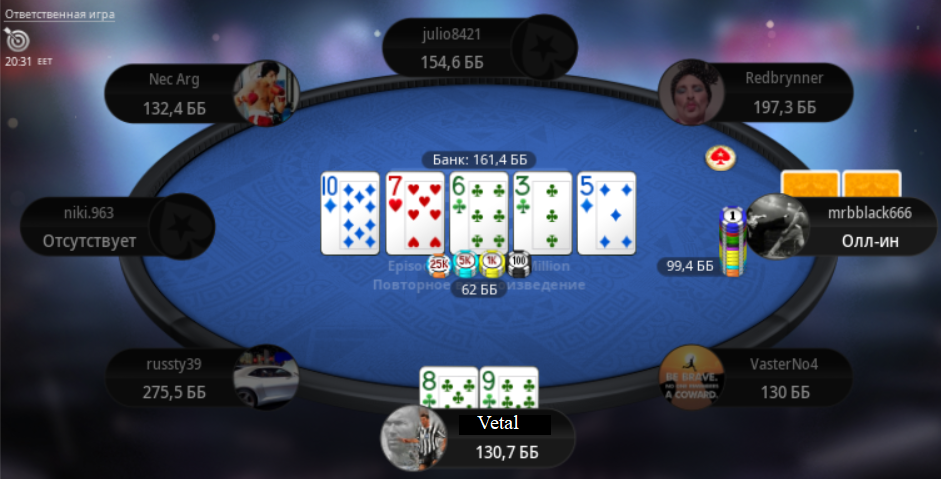 Один раз в мене був натс стрит на рівері, я бетнув і стіл закрив інший стіл, а потім дивлюсь я в ситауті й фішок не вистачає, а там оп рейзанув і в мене карти в пас пішли, бо час вийшов.
