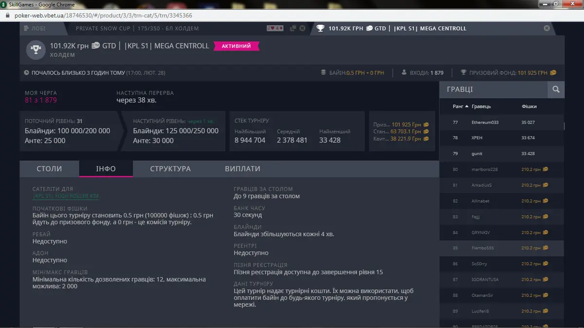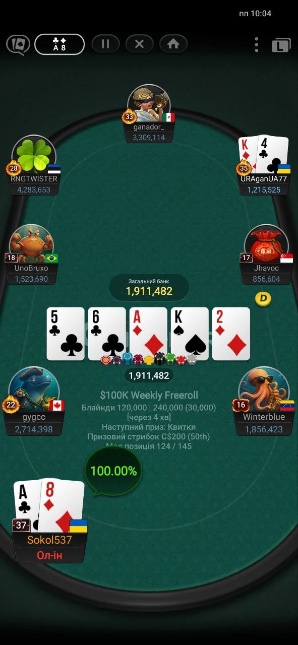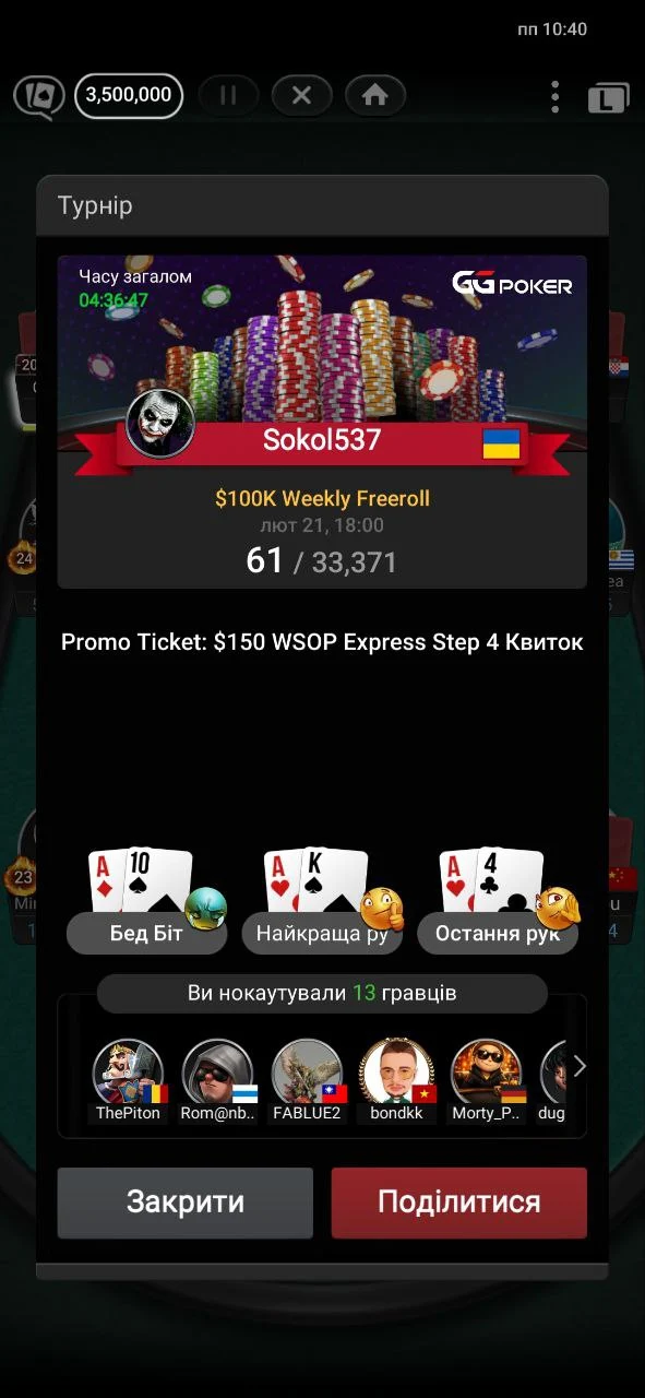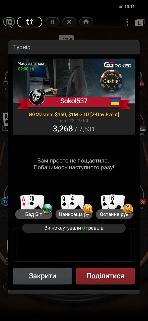 Зайшов у топ 30 з хорошим стеком, але був просто прибитий двома роздачами АК і КК - не вистояв проти АQ і АК. Ось такий біль.