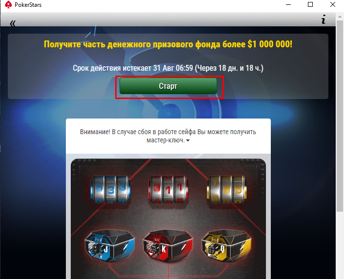 ПокерСтарс запустили нову акцію "The Vault", яка проходить з 10 по 30 серпня. Покеристи отримуватимуть спеціальні скрині з кодами і якщо вам вдасться відкрити їх за допомогою шифру - ви можете виграти до 5 000$ за один раз.