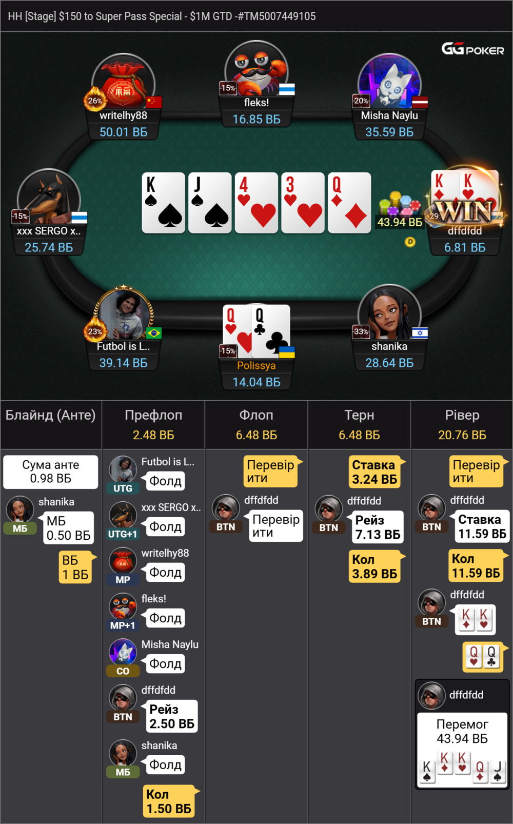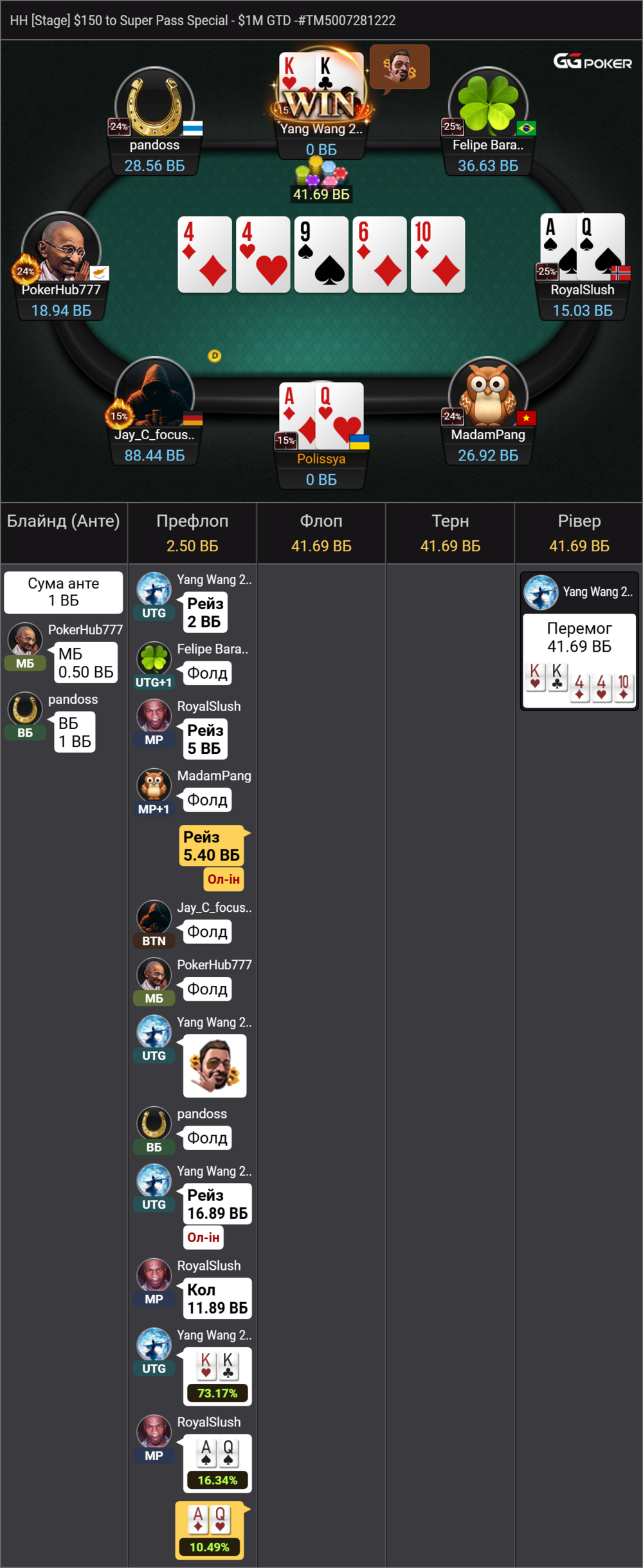 Я думав в нього туз шось, може навіть король, може тягнув флеш. Дуже обідно було бачити КК з якими він ще й чекнув флоп. Далі нічого вже не заходило а коли зайшло знову КК і я завершив турнір в середині на 54 місці.