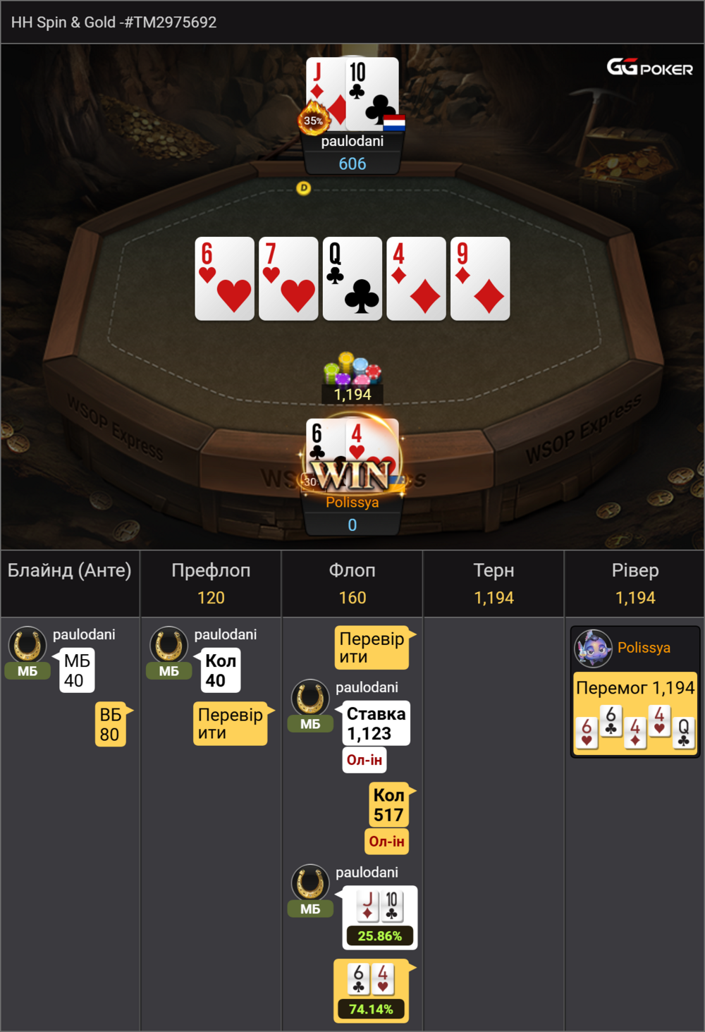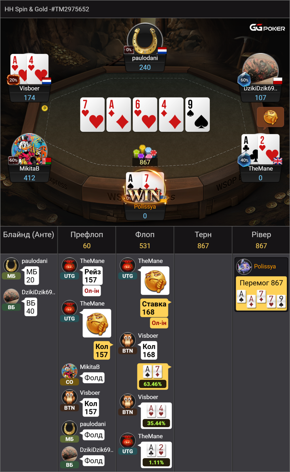 Далі вже цікавіше, спін з байін в 2 долара на 6 чоловік з одним призовим місцем. Тут A7 з двома парами допомогло мені зібрати фішок