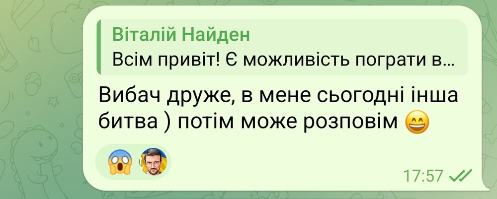 Веталь кличе пограти с хлопцями в шахи, вибач друже, наступного разу я буду у грі (напевно). В мене сьогодні інша битва...