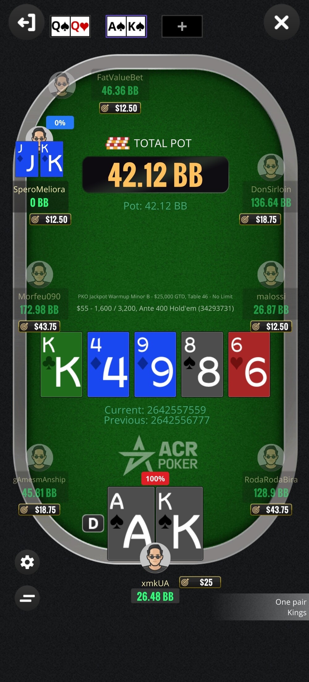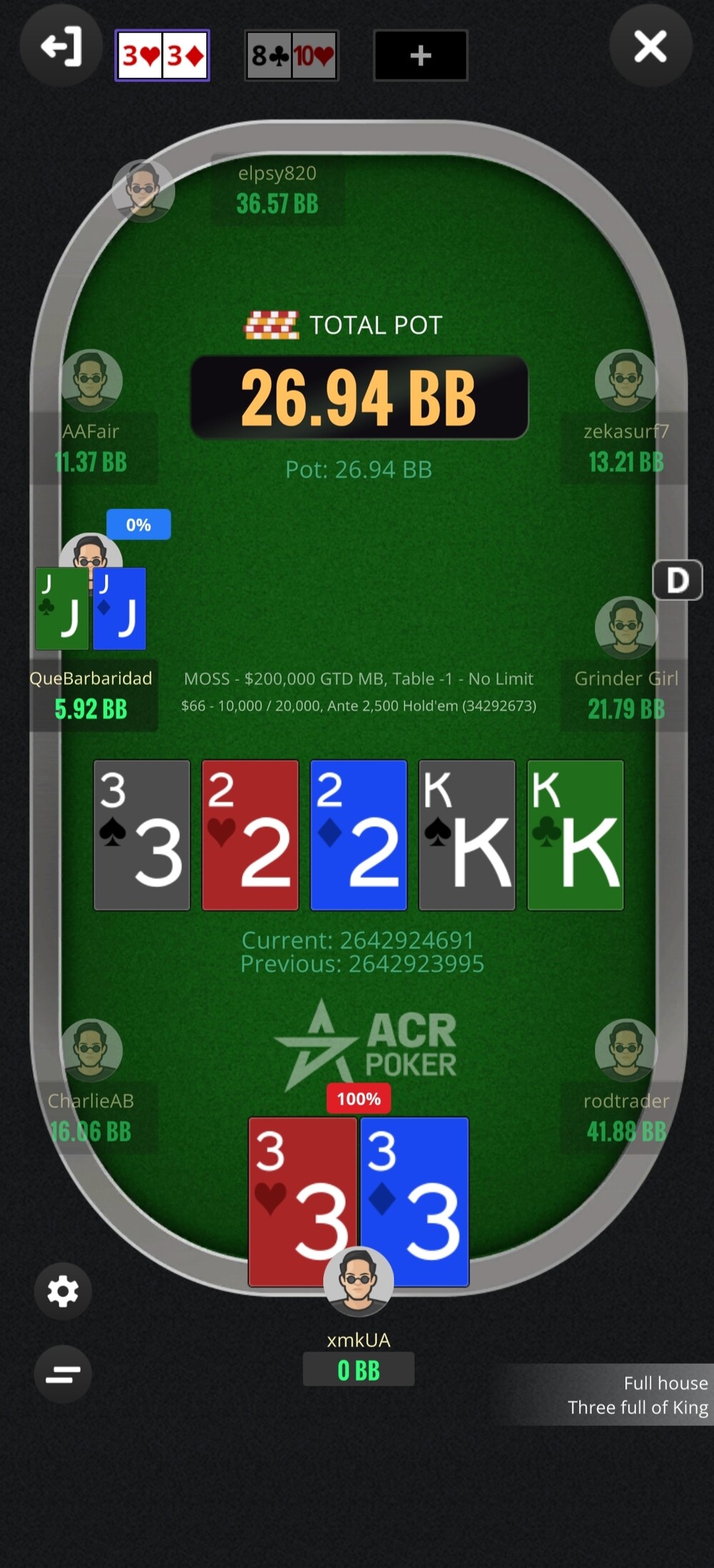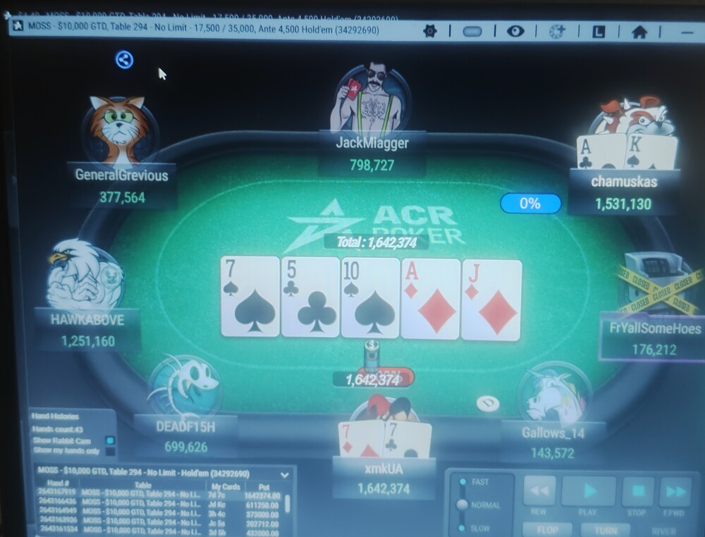 Вважаю, завдяки тому, що я граю нл25-50 кеш, я не дуже відчуваю тиск бай-іну. В мене немає відчуття, що це якийсь дорогий турнір і треба бути обережніше (в мене тиск з'являється на лімітах вище поки ще). Тому вважаю це мені і допомагає, бо іноді зажиматися не є гарно, хоч я і більше тайтовий гравець, але іноді міняю стиль під час гри. Часу мало на турніри, так би грав і грав.