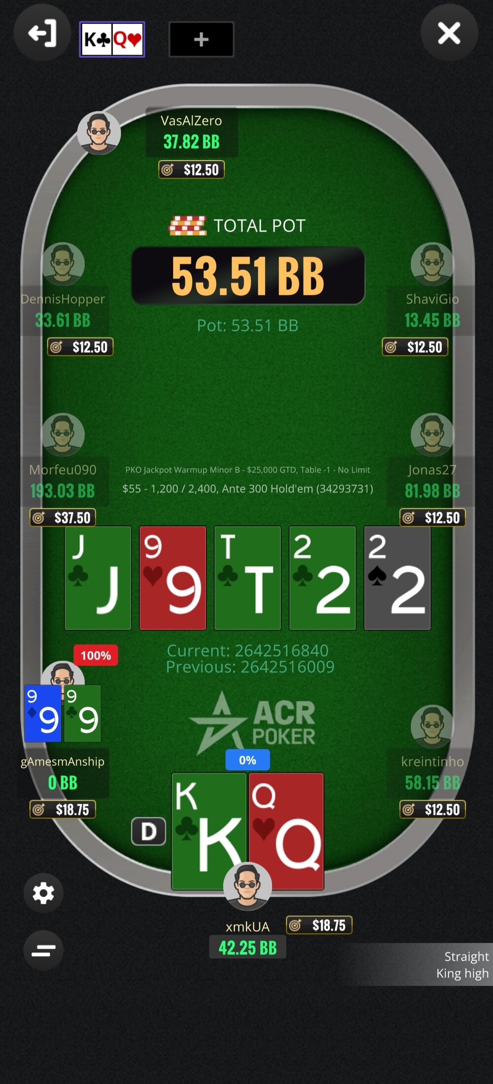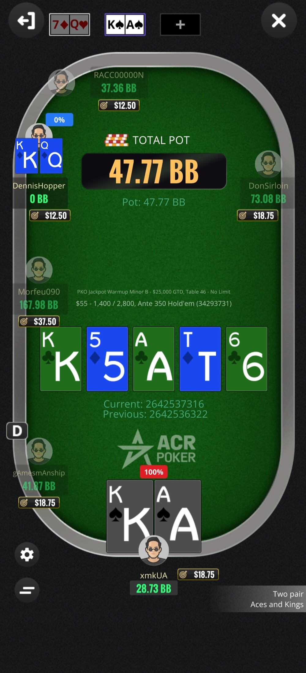 Вважаю що це була моя єдина помилка в цьому турнірі, я не покривав опонентів тому вирішив заслоуплеіть королів , залишити опцію на флопі для фолду ( все ж такі містері і ітм пей джамп). І тим самим залишив опцію для А9 пушити.
