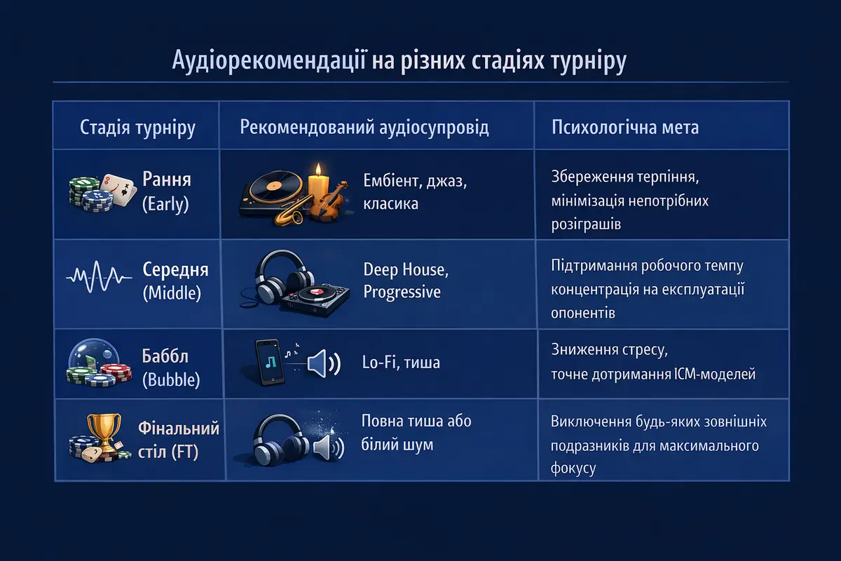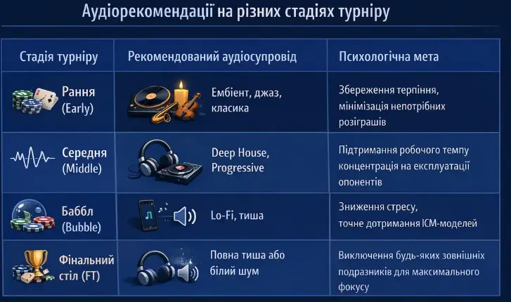 Досвідчені турнірні гравці часто адаптують свій акустичний фон відповідно до поточної ситуації в грі. Це дозволяє ефективно розподіляти енергію на дистанції в 10-14 годин.