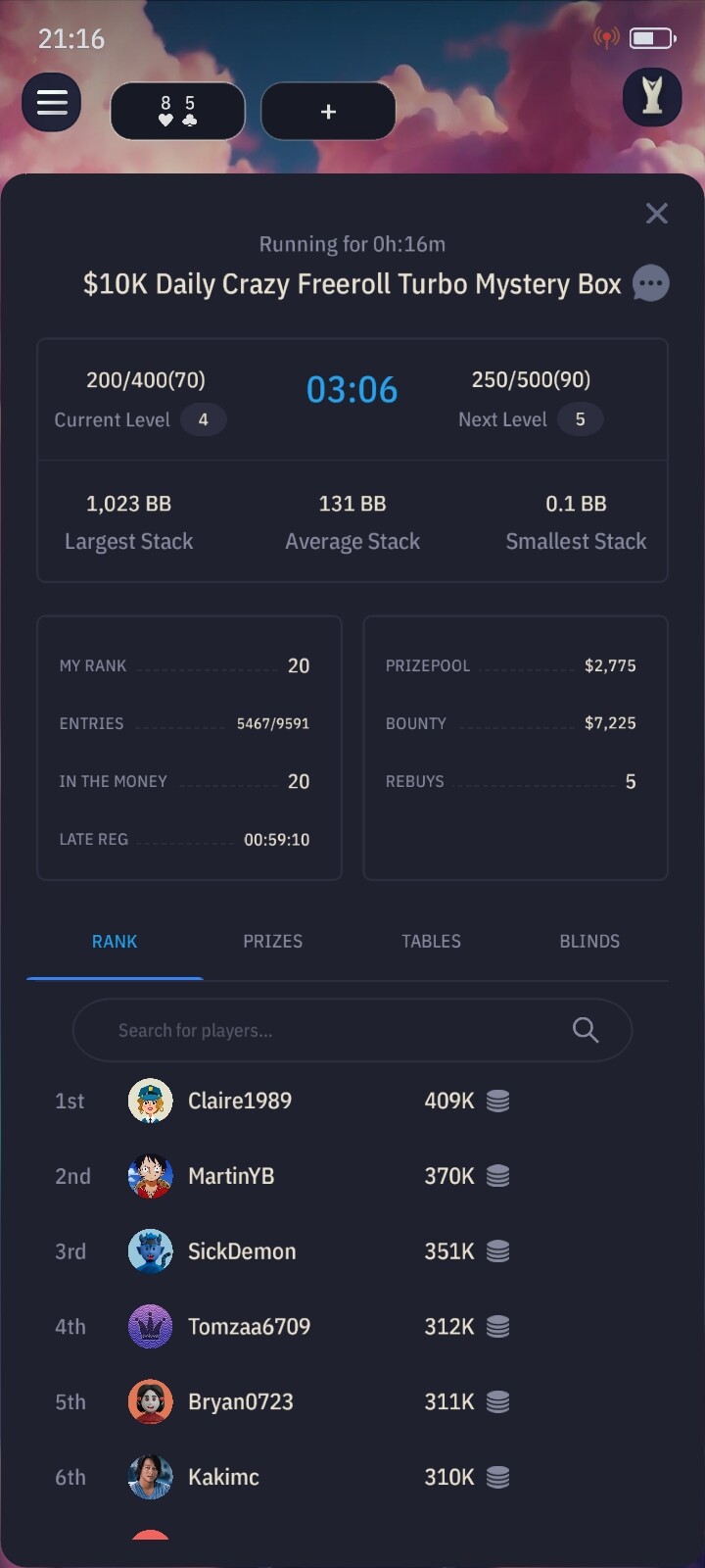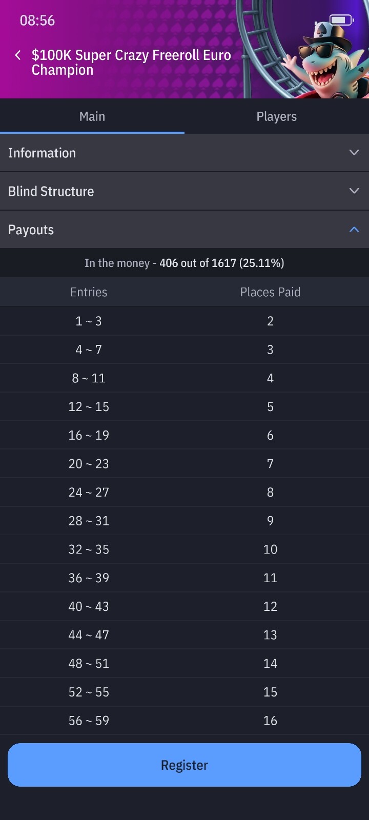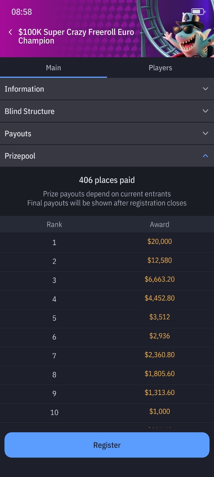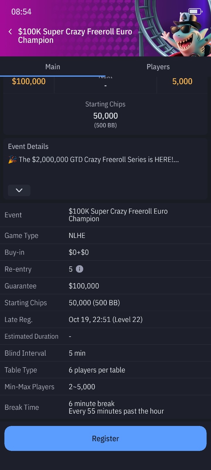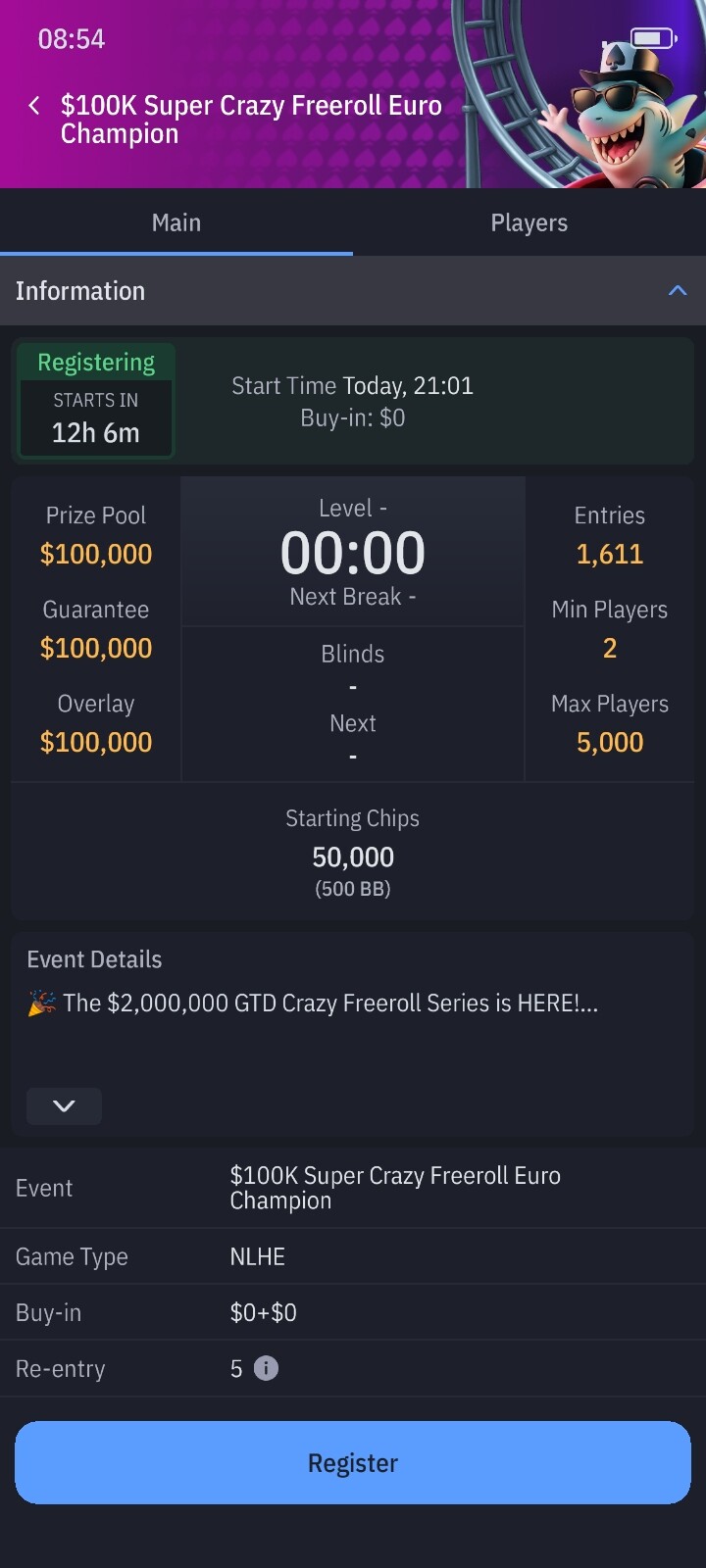 Стартовий стек 500 бб!!! пізня реєстрація майже дві години.Рівень 5 хвилин.Зверніть увагу що максимальна кількість гравців 5 тисяч -це дуже мало.