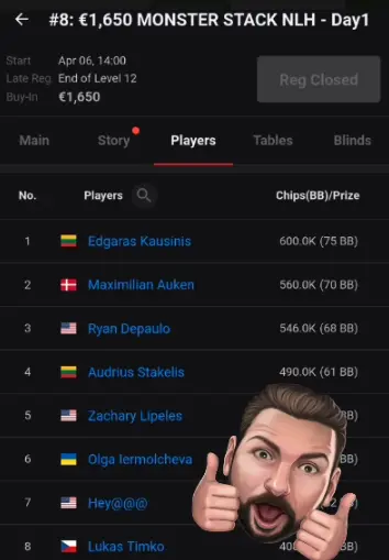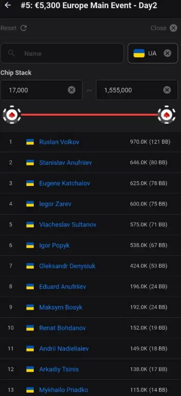 Першим, звісно, впадає в око легендарний Євген Качалов - він впевнено тримається в топ-3 серед наших зі стеком 78 ББ. Але чіплідером серед українців зараз є Руслан Волков - у нього просто монструозний стек 121 ББ!