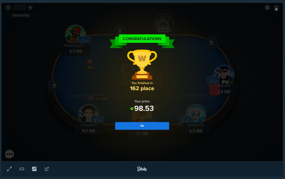 - Christmas Freeroll на Stake - 162 місце, (не топ-10, але для фріролу з величезною кількістю людей - цілком приємно)