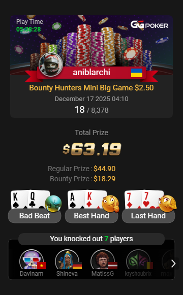 - Bounty Hunters Mini Big Game $2.50 на GGPoker - 18 місце з 8378 гравців