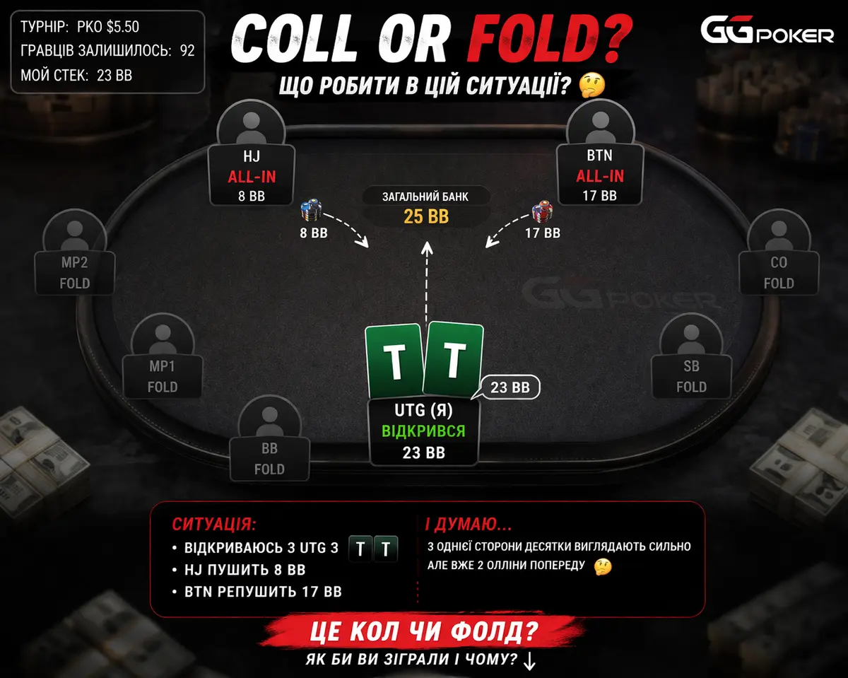 Пацани, допоможіть розібрати роздачу , турнір PKO $1,08 на GG. Залишилось 92 гравця, у мене 23BB відкриваюсь з UTG з TT. Далі ситуація: HJ пушить 8BB і ще один гравець дає репуш 17BB І от думаю — що тут робити? 🤔 З однієї сторони десятки виглядають сильно але вже 2 оллини попереду Це кол чи все ж фолд? Як би ви зіграли і чому? Я більше схиляюсь до фолду , але сумніваюсь .