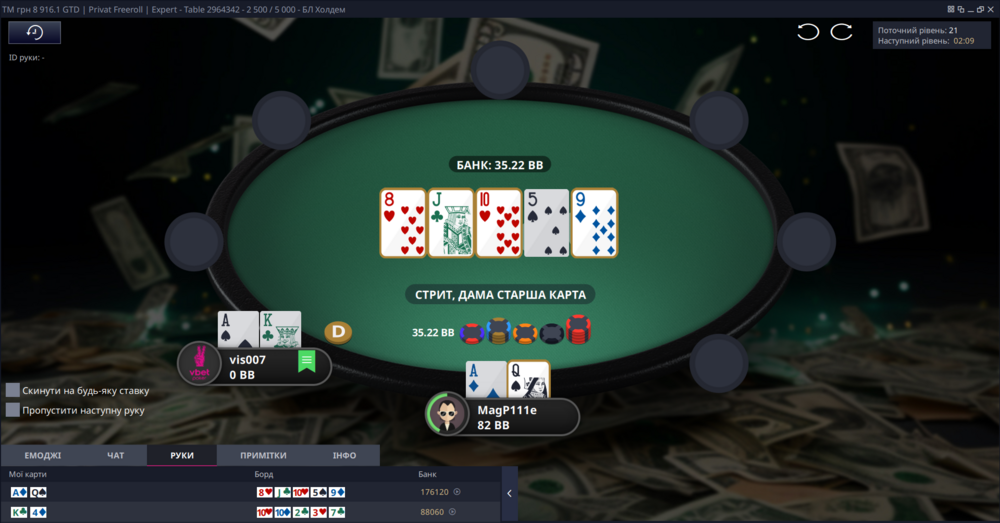 Надалі гра заспоїлася десь години на півтори. Ніяких роздутих банків, ніяких виставлень. Я поставив собі на мету зменшити свої колд-коли, змістивши частину у 3бети – фішки потихеньку примножувалися, але блайнди зростали швидше . (Та й ви прекрасно знаєте і самі як воно буває – один невдалий спот і сидів би «об*сраний» і надалі колив🤣🤣).