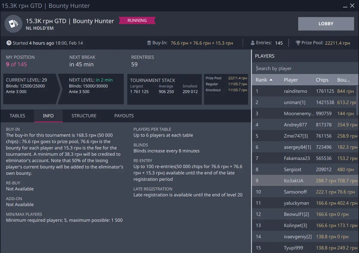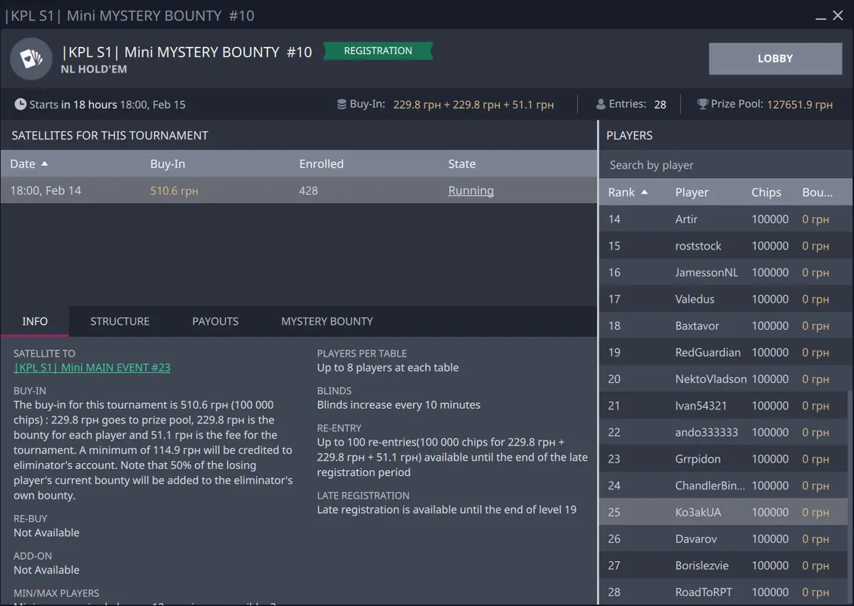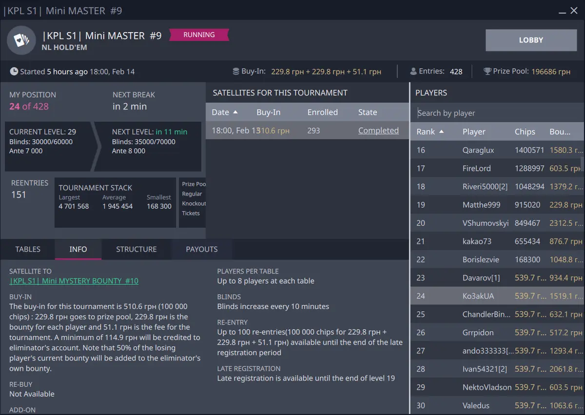 Потім були заплановані 2 турніри, які починалися о 18:00, а саме, Bounty Hunter за 168₴ та головна подія вечора для мене Mini Master за 511₴.