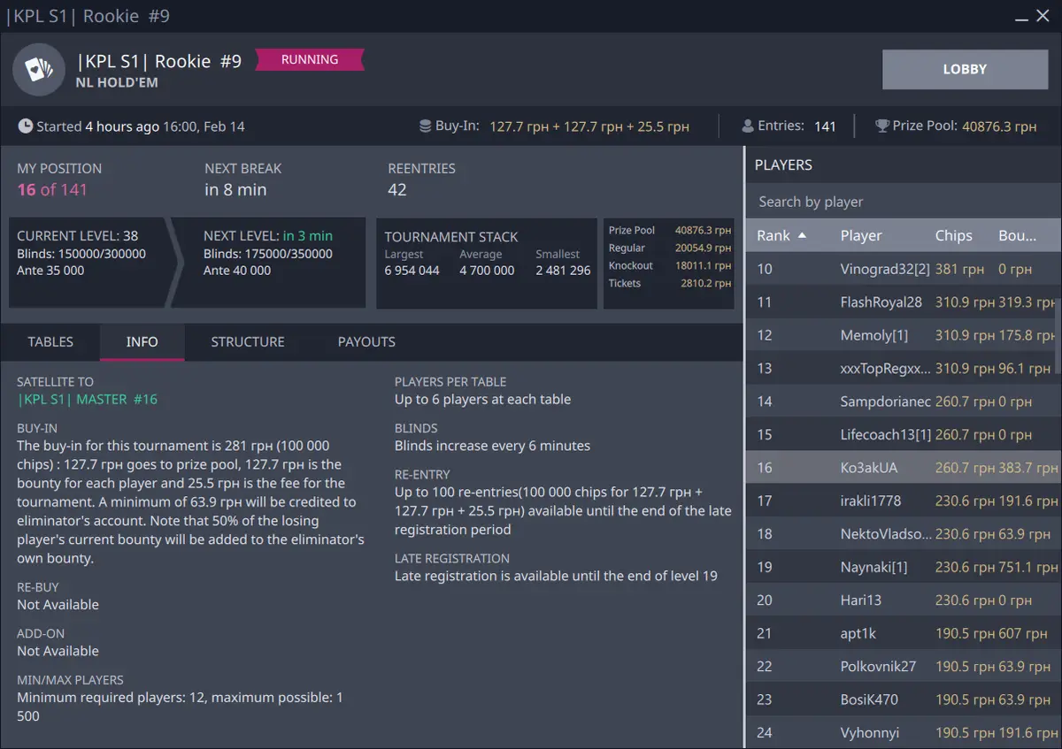 О 16:00 починався 1-й з цих 3-х турнірів - Rookie за 281₴, але я трохи не встиг на початок і лише о 17:00 застрибнув у нього в пізню реєстрацію. Результат цього турніру був досить непоганим - 16-те місце і 644₴ призових: