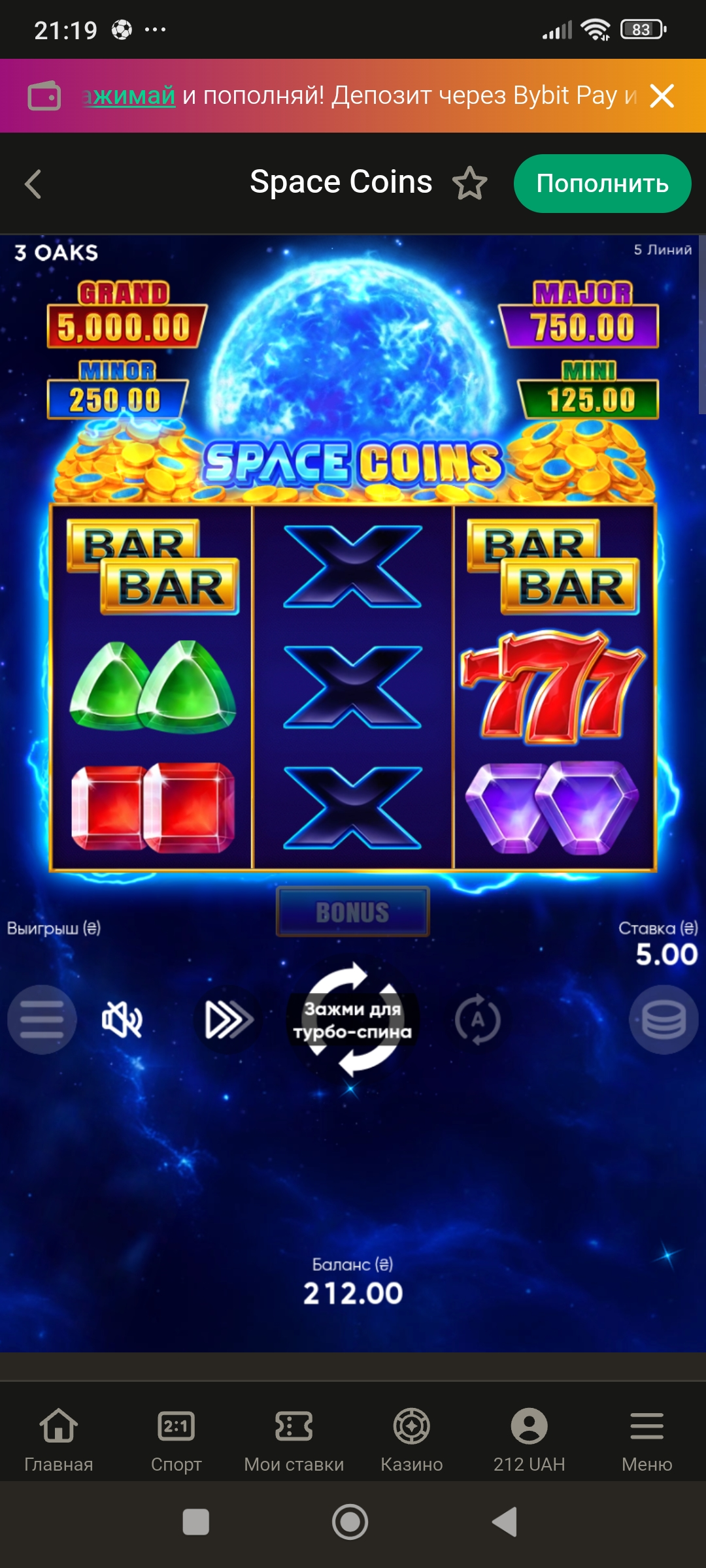🌌 Вибір гри: Космічні заноси у Space Coins Коли основна частина вейджера була позаду, я вирішив змінити локацію і перейшов у слот Space Coins від 3 OAKS. Чому саме він? Висока динаміка. Зрозуміла механіка «Hold and Win». При ставці у 5.00 UAH вдалося тримати баланс і поступово закривати залишки вейджера. Як бачите, на балансі вже 212.00 UAH чистого результату.