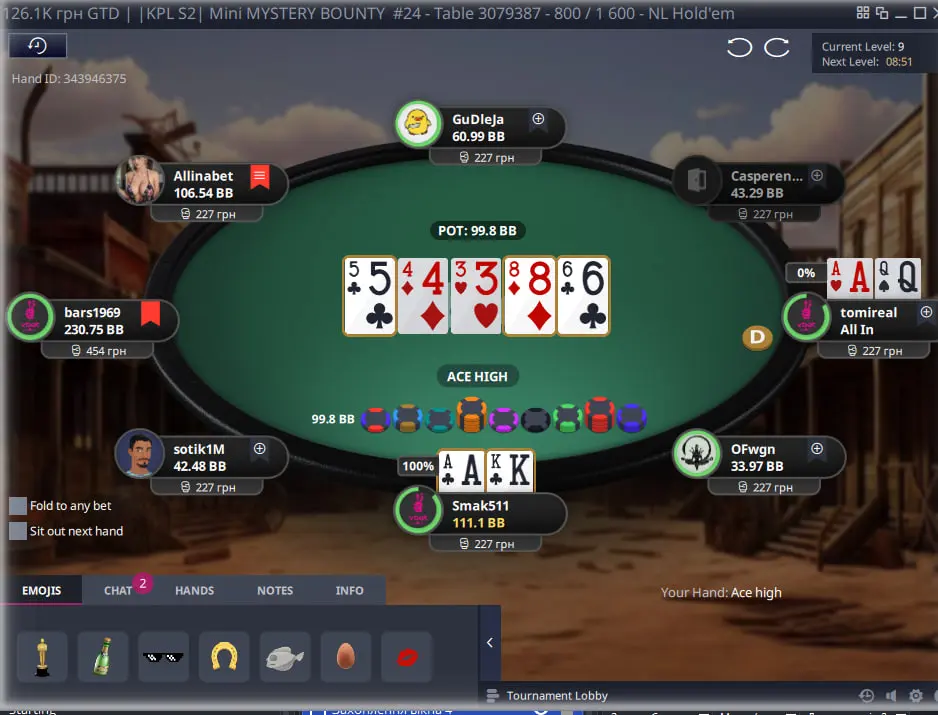 В мене залишився турнір з входом $12 і це був IKPL S2I Mini Mystery Bounty #24 в якому все почалось доволі непогано. Спочатку вдалося подвоїтися з АК проти АД