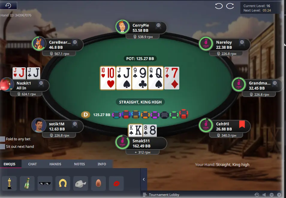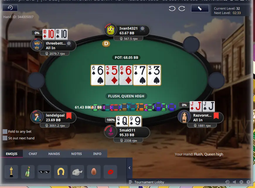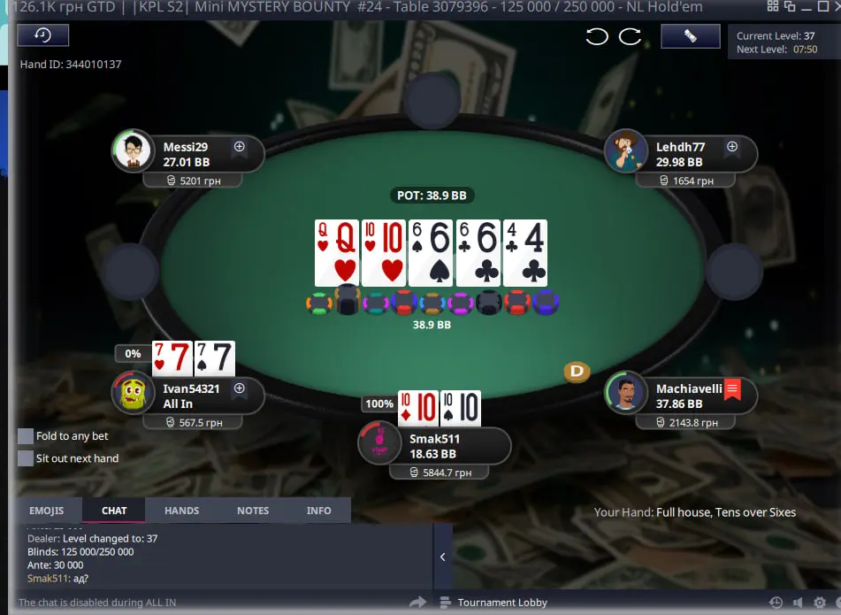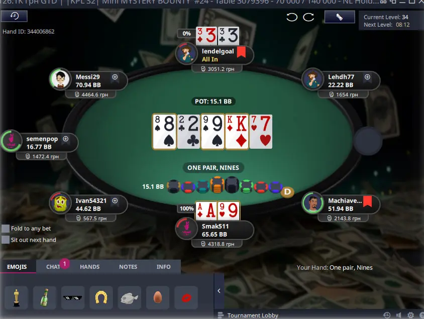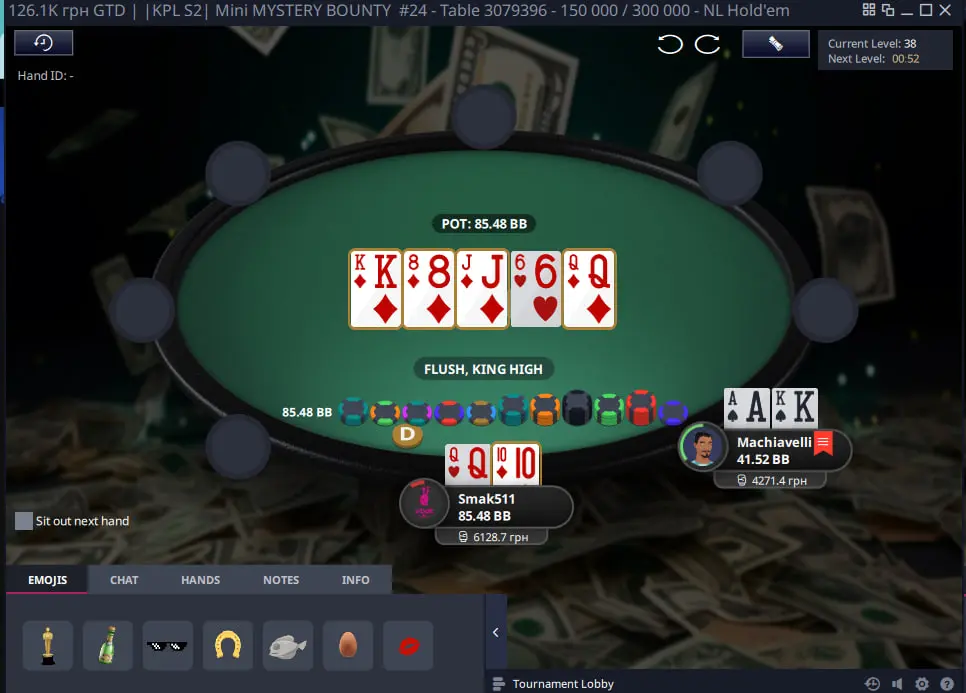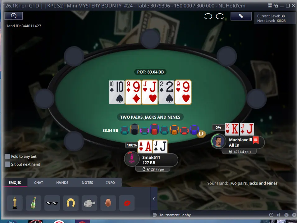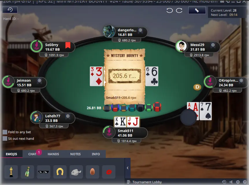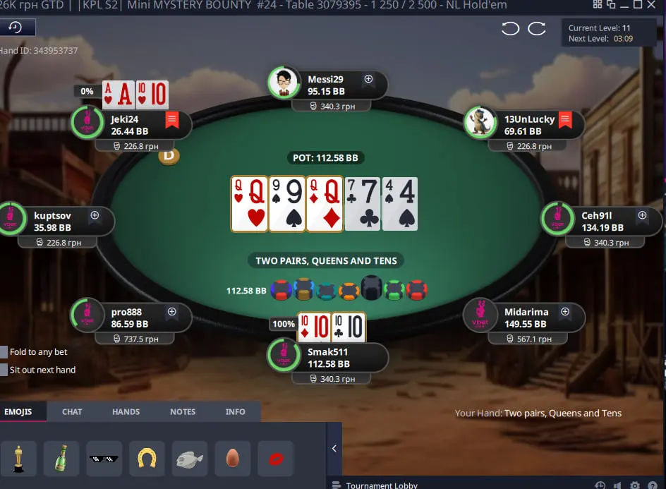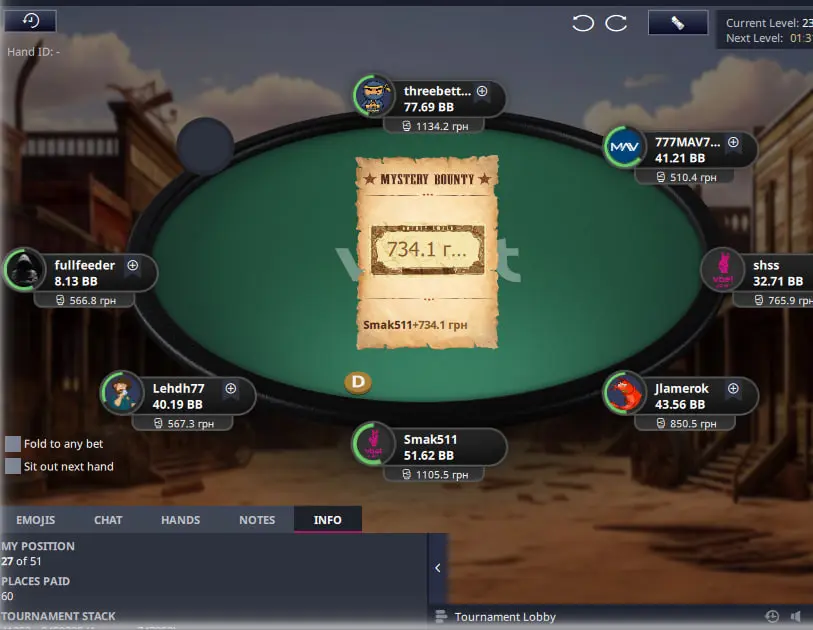 Важливо в такому форматі турнірів з містері набити гарний стек щоб у подальшому коли почнеться містері стадія мати перевагу над іншими гравцями, адже діапазон поїздки за ноки має бути дуже широким. Тож через деякий час я зміг виграти велику кількість фішок з КК та К8 на доволі піздній стадії та стати другим стеком у турнірі.
