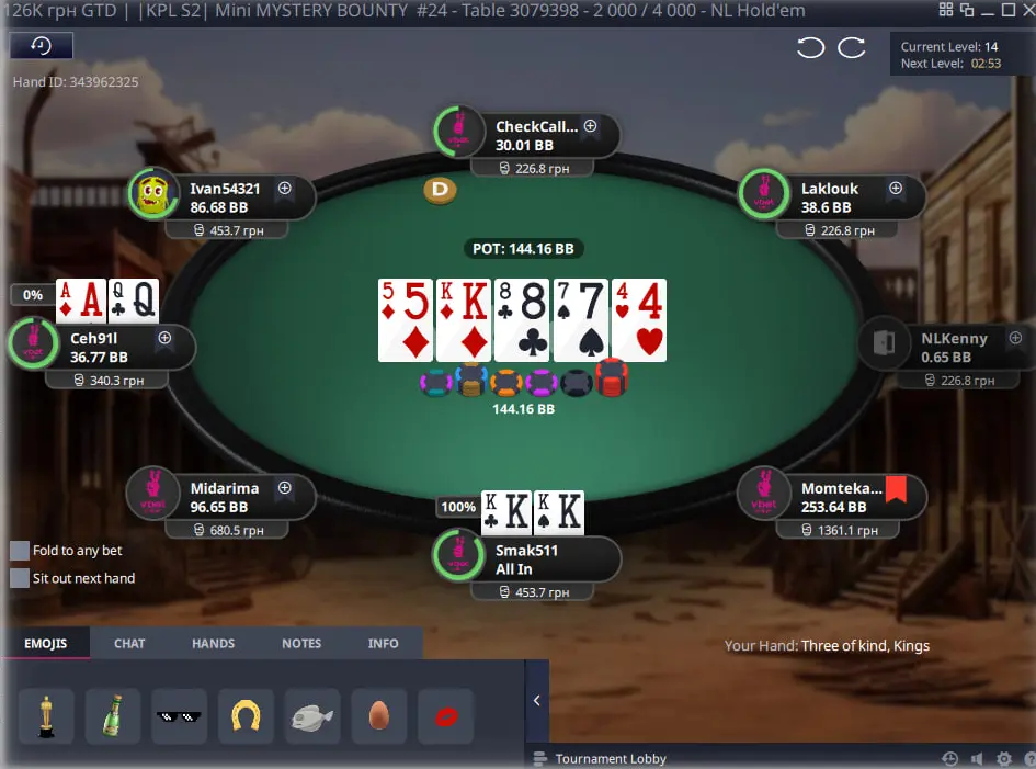 Це була звичайна неділя, але саме такі дні на VBet завжди особливі, бо саме тоді стартують Mystery Bounty турніри 🎯 Я, як завжди, вирішив не пропускати цей момент і зайшов одразу в два турніри — Mini Mystery Bounty та Mystery Bounty, щоб спробувати зловити свій шанс на топові містері нокаути. Я навіть не уявляв, що цей вечір запам’ятається мені надовго…Сесія почалась з дуже неприємної роздачі в IKPL S2I Mystery Bounty #24 — суперник відкрився open-raise, я трибетнув с КК, на флопі поставив продовжену ставку, суперник не відвалився, а вже на терні я вирішив тиснути олл-ін. Здавалося, що я отримаю кол з якимось J але опонент натиснув кол із 77 і примудрився доїхати в гатшот, закривши стріт 😤Отаким чином я тільки на старті сесії вилетів з самого дорогого турніру за $55
